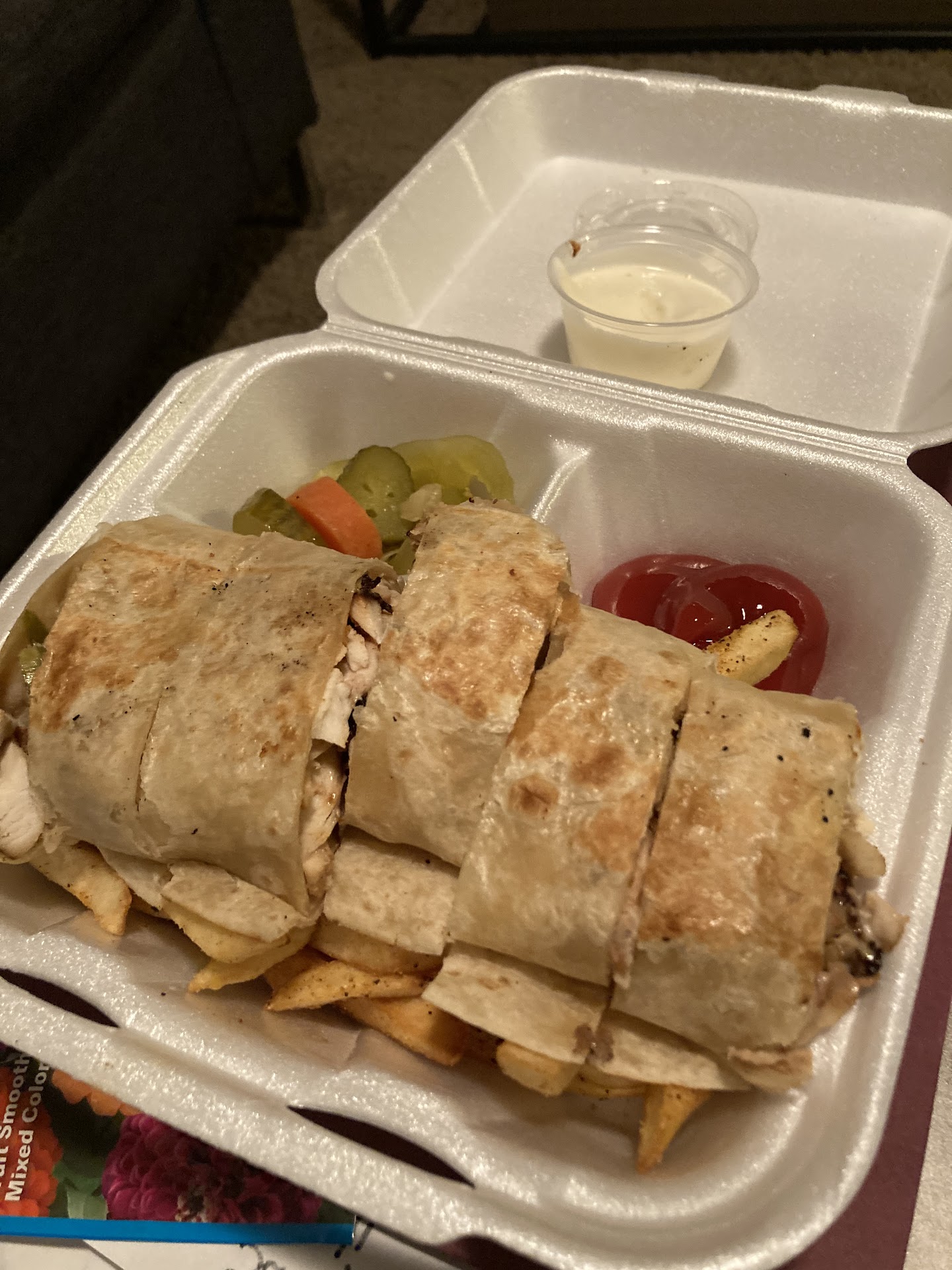 It was no surprise when I returned that he was back on his cell phone sitting again in front of the truck and welcomed me with the now familiar look of disdain. My food, the thing I hoped would make up for the very lousy custmer service? Well, kebabs are typically, and previously here, meat chunks not long strips of meat, which the size and shape certainly didn't require the 45 minutes to cook, but the real over the top nonsense was the undercooked fries. Moreover, but again not surprising was the very overspiced meat, which although he knew I had been there recently was seemingly cooked that way punitively.