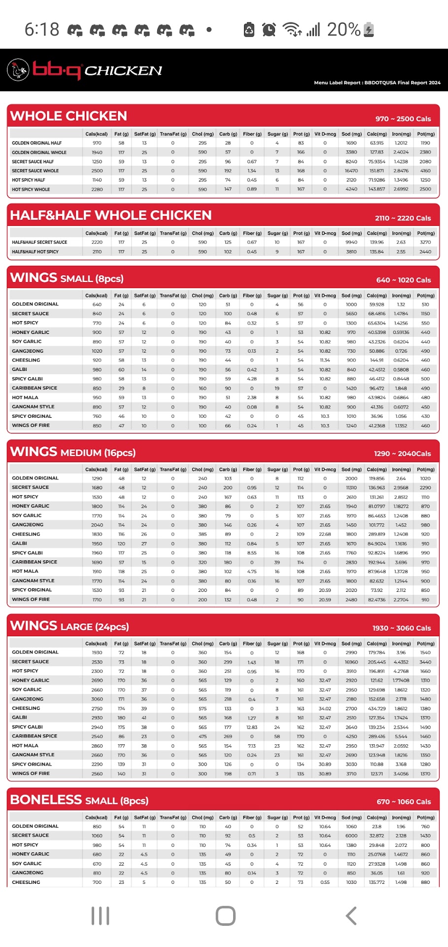 Read moreVery good food, though the calorie information needs to be updated. The 9 piece meals should not have the calorie details of the 16-piece meals, and the 18-piece meals should not have the calorie details of the 24-piece meals. For people like myself, who are counting calories, having misleading information like that can drastically change what we choose to eat in a day. It's also misleading about the amount of food you're getting.
