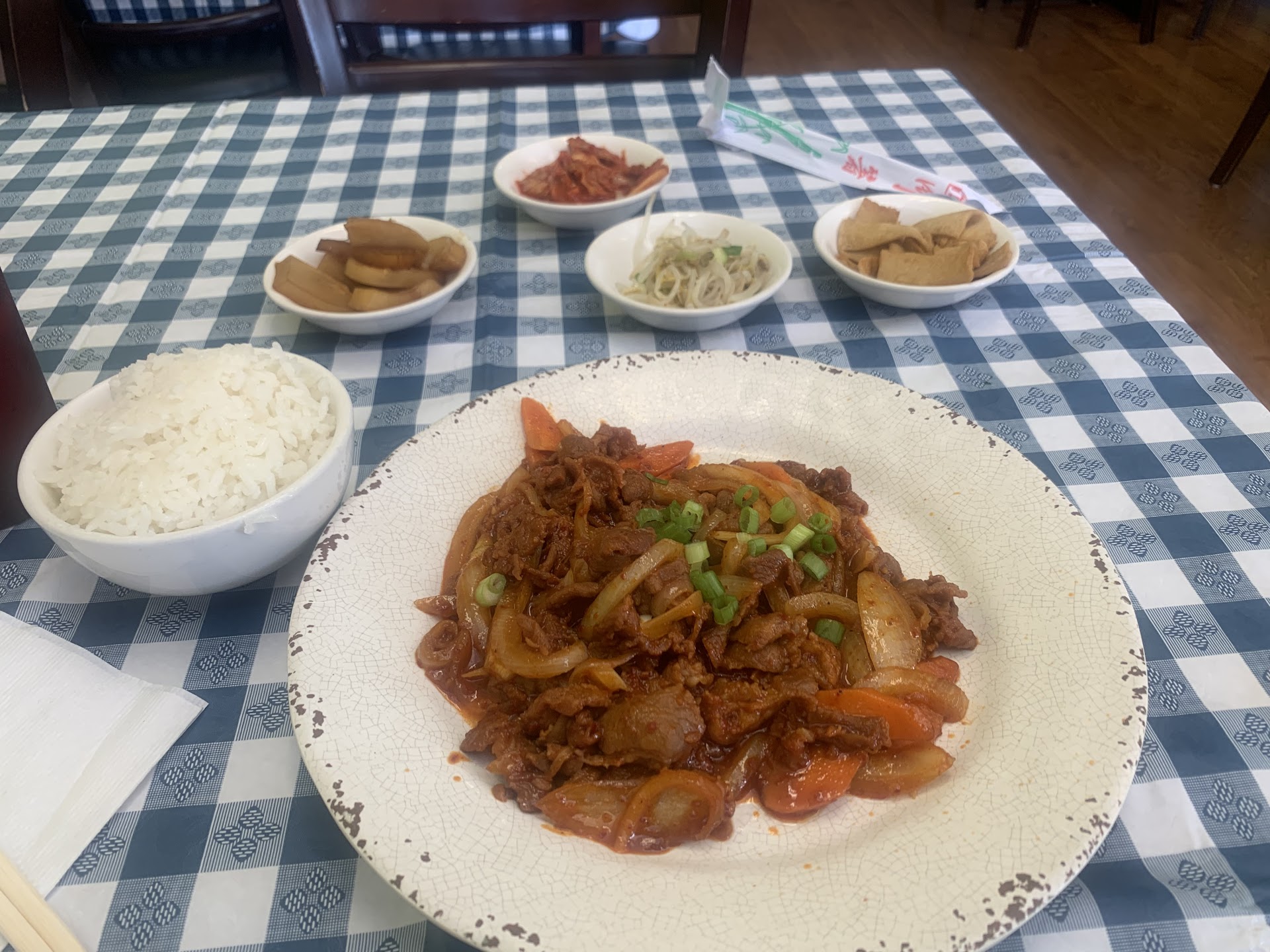 However, the main problem was my waitress(the cashier lady), as she never came by to fill my drink or ask how the food was , which I complain about because I went through my water cup quicker than I could eat the dish because of how spicy the food was, which in hindsight was a primary reason the spicy bulgogi was so unpleasant to eat. I only point this out because I was the only customer in the restaurant at the time and it baffles me how she could overlook a customer suffering to work through such a dish. Like I was literally sweating and roughing it out the whole time trying to finish the dish without water to wash down the spiciness . So overall, my experience wasn’t too pleasant in that regard and is why I didn’t rate this restaurant too high. The customer service and attention to customers could use some work. I’d say the food was fine, but if I come again I’ll try to order a different dish that isn’t spicy.