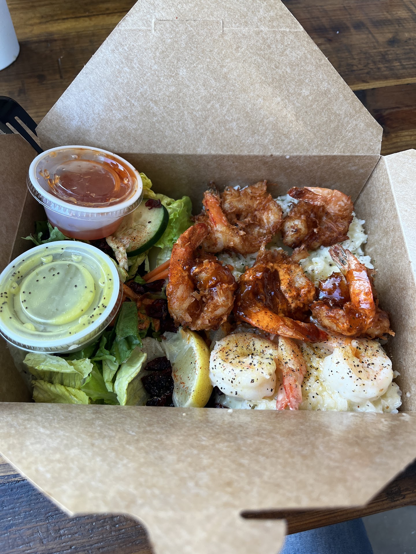 Read moreLet's start positive, the food here was delicious! I ordered the sampler which comes with three flavors of your choice. I ordered the coco shrimp, sweet and spicy, and butter garlic. All three were cooked perfectly and tasted delicious. Each box comes with shrimp, rice and salad and the portions were better than expected. The salad was great, although I picked out all the craisins. The rice comes buttered which I also liked. They offer two salad dressing options Creamy Ginger and Poppyseed Vinaigrette. I chose the poppyseed and it was spectacular! I loved it. I noticed the website says there's also a cilantro lime sauce, which may be coming in the future, but I didn't see it on the menu during my visit. The only reason I gave 4 stars to the atmosphere was because of the building itself. There are three entrances and the location of the ordering counter makes it really difficult to figure out where to stand or whose turn it is next as patrons are entering from all sides of the building and there's just not enough space to form a logical line. Service was quick, we were in line less than 6 minutes and staff asked us to rearrange ourselves more than once in those 6 minutes so others could pass by or make there way into the line. It was crowded and confusing. The way they deliver orders is also a bit chaotic. They don't provide numbers for you to take to your table or call out your name/order number when it's done. They just had staff walking around with the food asking each table if it was theirs. They had a name, but it was loud in the building and our server was very quiet so we couldn't hear who she was asking about until she was at our table. Despite the disorder, staff was very friendly, service was quick, and our food was excellent. I...