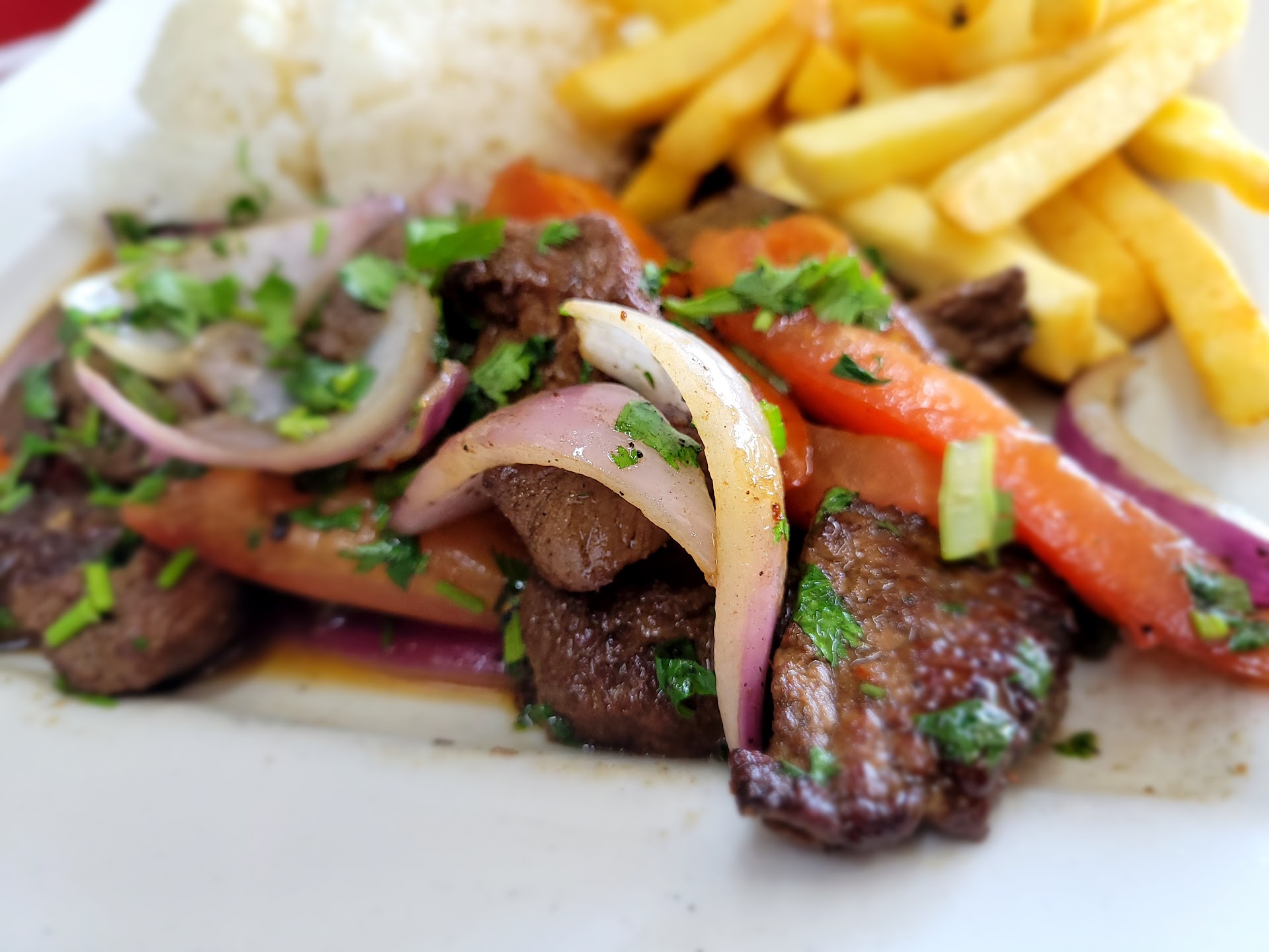 I ordered the lomo saltado, which is a stir-fry of beef, onions, tomatoes, and french fries. It was delicious! The beef was tender and flavorful, and the vegetables were cooked perfectly. The french fries added a nice crunch to the dish. I would definitely recommend this dish to anyone who loves Peruvian food.