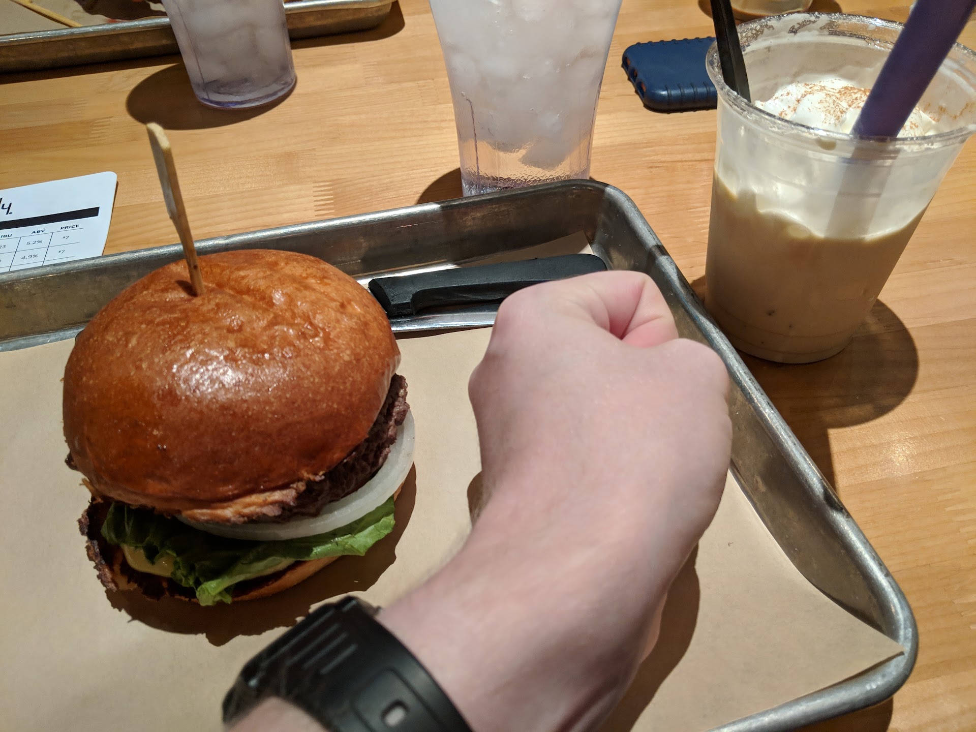 So, let's talk about the food. The shake, something that is meant to set Hopdoddys apart from competitors, was quite simply not good. Granted, this is subjective, but I did not enjoy chocolate in my root beer shake. Also, they came out already quite melted. The burger, while small for it's price, was the only redeeming quality of my visit. It was very tasty, but not enough to fill me; and I had to eat elsewhere afterwards. I've left a comparison picture of the burger with my relatively small hands.