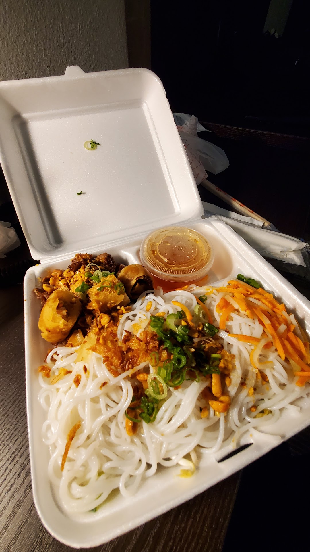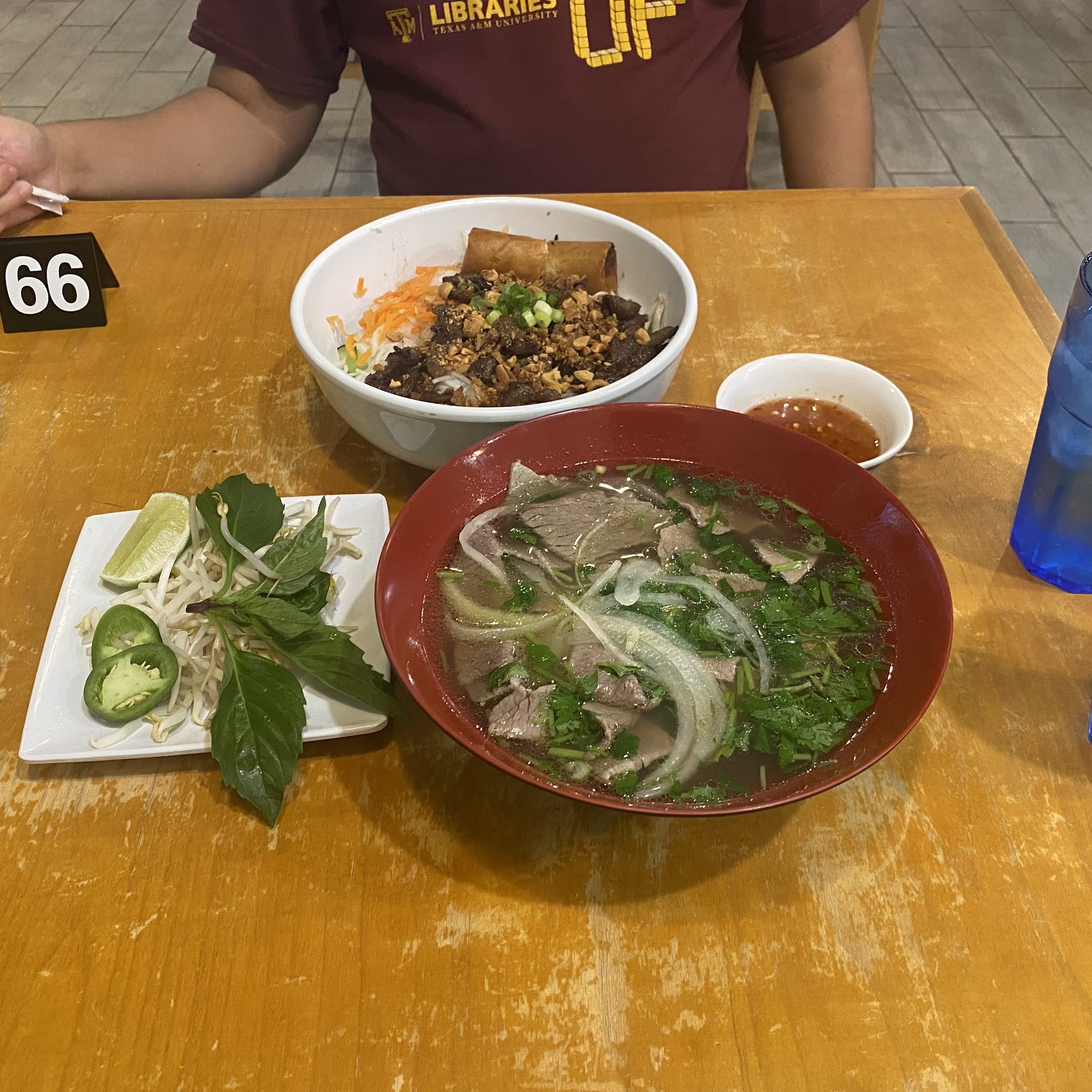 Read moreI would have liked to have given this place a 4 because the flavor of the pho broth was just ok, although it was a little salty, and they had boba tea with tapioca, which I hadn’t had in too long. But I’ve given 3 stars because I really wanted a vegetarian pho, which they had on their menu. They were out of tofu and so I asked what type of vegetables they had in vegetarian pho, thinking I’d still be able to have a good bowl of soup. I’m glad I asked because I was told there would be no vegetable, only tofu, but there is no tofu. So, I also could not have a vegetarian spring roll bc there was no tofu. I wouldn’t necessarily count the lack of tofu against them, considering all the shortages now. But it was on the menu. I decided to get chicken noodle without chicken, as I wasn’t sure what flavor the vegetarian broth would have with no vegetables. Like I said, the taste of the broth was good, however, it was a tad too much salt for my taste, but it was pretty light on basil, only a grind or so of cilantro, 3 slices of jalapeño, and a handful of bean sprouts. I usually have a hard time eating all my large size pho at other restaurants, but didn’t have that problem here. I thought I might get plenty of noodles, since I wasn’t getting any chicken. No such luck. I didn’t think of ordering extra noodles, which would have been possible. I did like the boba tea, though, and the little crispy onion bits in the pho, but I could have turned around and gone to Nam where they have vegetarian pho with actual vegetables in it. But then I wouldn’t have been able to get that boba tea. Next time, I’ll get pho from somewhere else and just pick up the tea...