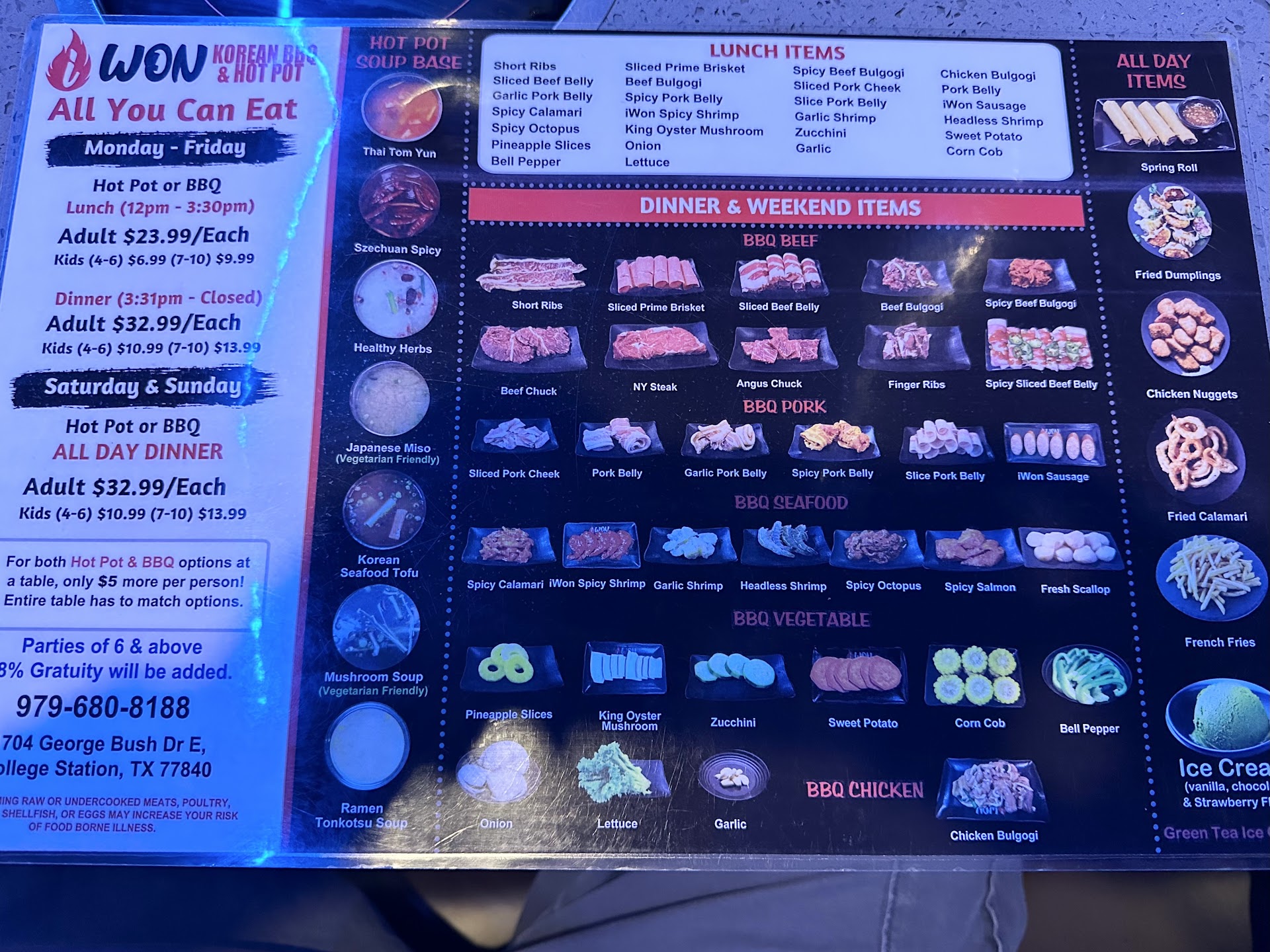 First, it's $32/per person (dinner) for ALL you can eat- yes, ALL you CAN eat. They have different prices for lunch and kids. Everyone in party has to partake (no water only visitors). You usually order in rounds of 3 meats but IWON lets you order as much as you want per round. *note: if you waste food- they charge you $10 per plate so I always err on side of caution and order more as needed. No need to hoard!