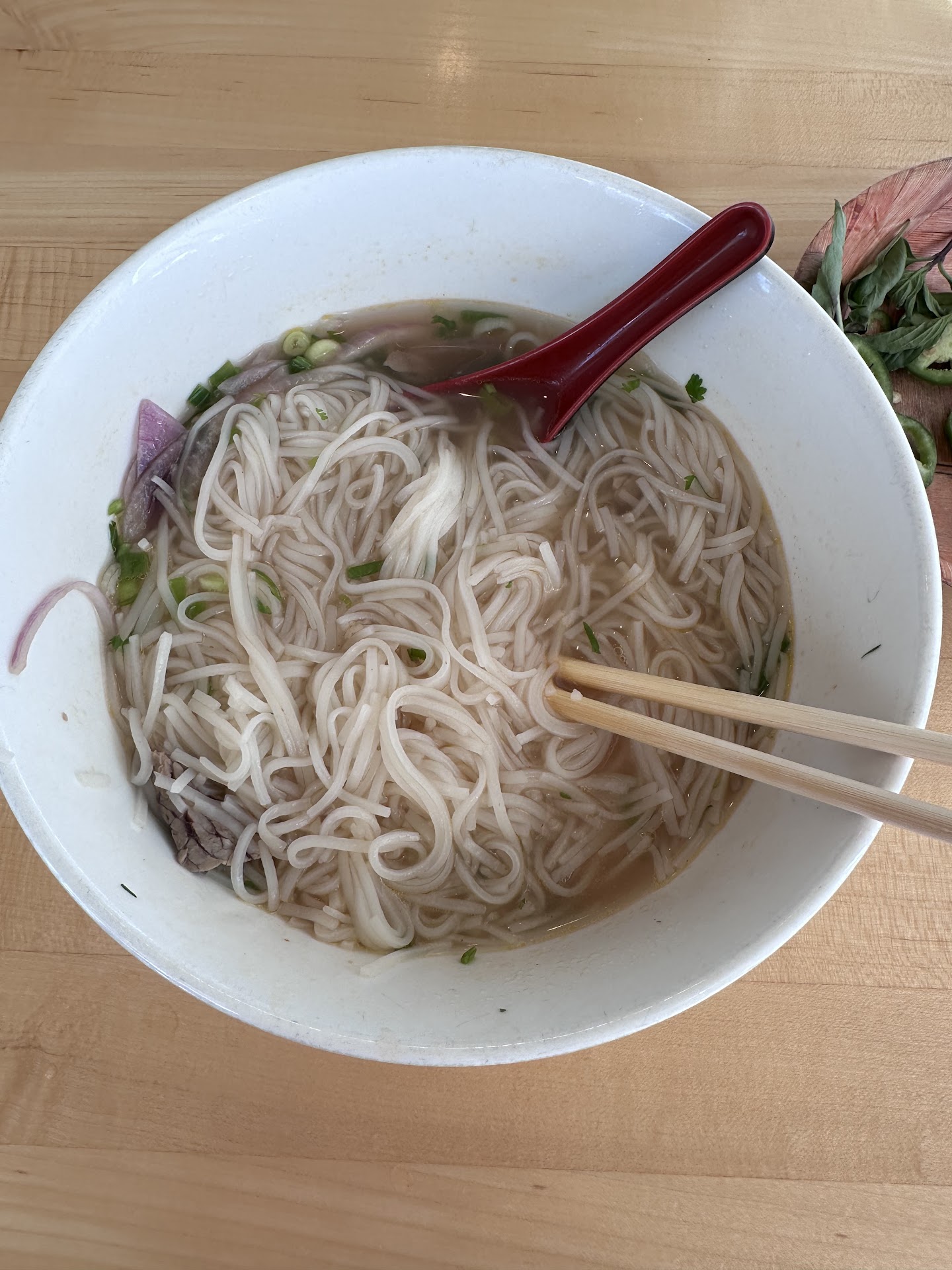 Vegetarian pho: Yum. The aroma of star anise was a portend of the great taste to come of this wonderful, spritely pho with jalapeño, a generous portion of bean sprouts, onion, basil, and, of course, rice noodles. Hoisin sauce and sriracha were the perfect condiments.