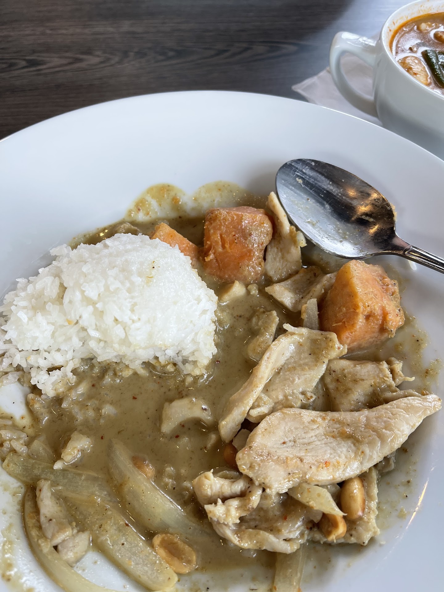 I had ordered yellow curry and a small bowl of Tom Yum. I had to ask for my Tom Yum. My yellow curry was ok, what there was of it. The curry did not even cover the bottom of the bowl. The potatoes were not “yellow” as the menu described or has pictured, but sweet potatoes or yams. It was odd, both in flavor and texture.