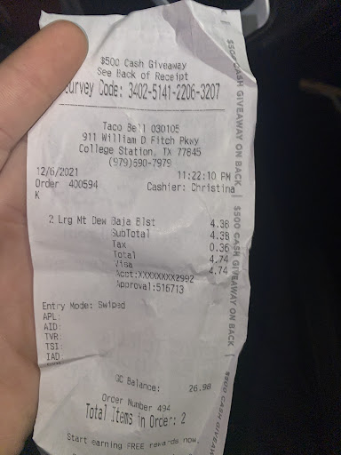 Read moreI didn’t go physically to Taco Bell but my bf went and got us food around 8:33pm. One thing I hate is spending a good amount of money on cold food. . I paid $30 here because every now and then I like to eat Taco Bell. I love the chalupas. I expect a fresh chalupa at least. I could have went to wings and more where I know my food was going to be fresh. I will not be coming here again. This is the 2nd time I’ve sent him to get food and the stuff is cold ! The first time I had to go back and get a fresh chalupa ! The chalupa was cold again this time , bread was not fresh it was tough. The soft taco was cold . I had cinnamon bun thing (2) and they were fresh and good and the cinnamon twist . I also had a watermelon/lemonade freeze (paid extra for) and it was like a soda . No freeze to it. I will not be coming here again we’ll not to...