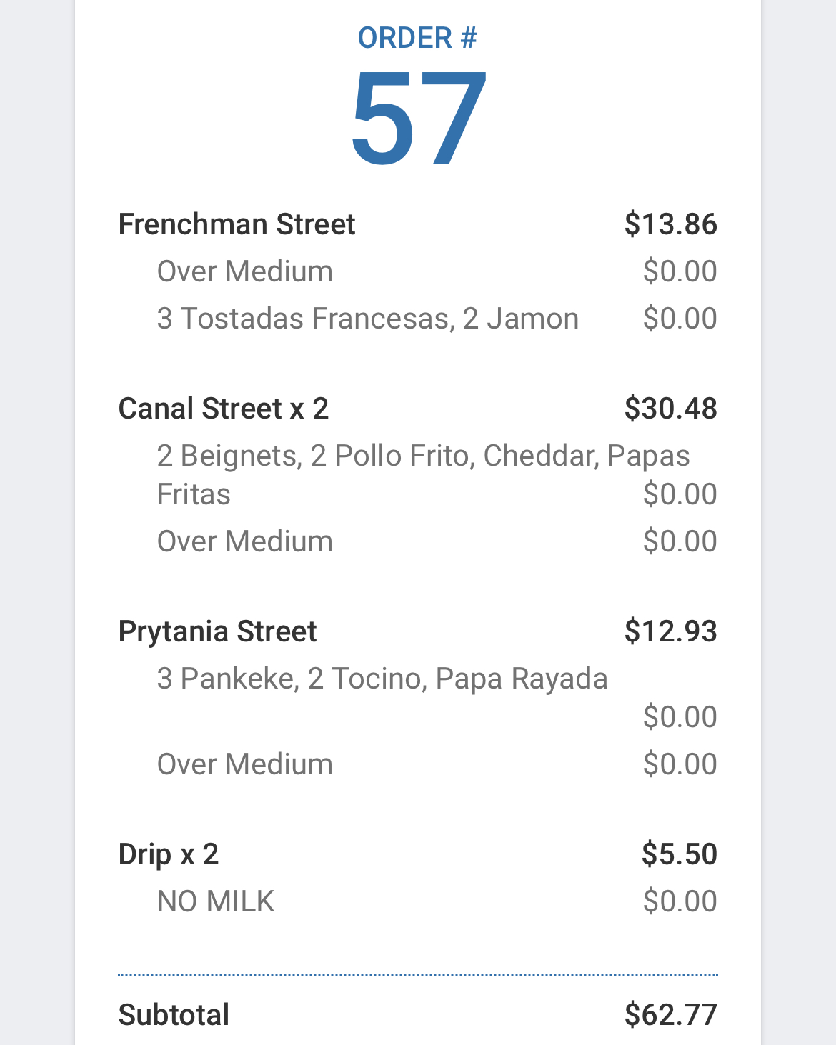 Read moreCute atmosphere horrible service and even worse food. Worst 70.00 Iâve spent in a long time.. we walked up and ordered 4 meals and two house coffees. Food took about 30 min to come out. Which wasnât a big deal but when it arrived, bacon was cold on the prytania dish .. fries were cold and gravy was cold on the canal street dish. The Frenchman st dish consisted of French toast that tasted like it had been sitting in a fridge uncovered for too long. We never recieved our coffee.. I asked a worker if we had to wait up front and she said no that it would be brought out.. a different Worker brought out coffees that werenât what we ordered and we told her that was the wrong ones she then proceeded to take those back but never brought us our coffee. We told the manager that we hadnât received our coffee and that the food was cold but he made an excuse that they were short staffed and never made an attempt to make it right.. said the coffee was still coming.. mind you .. I ordered house coffee!!! Nothing special.. well we finished our meals and went to ask for a refund of our coffee and he just handed me cash and said nothing.. shouldâve asked for my tip back too!! Worse...