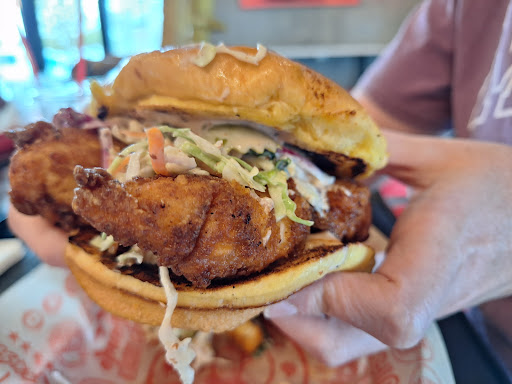 Read moreI was pleasantly surprised to find this place was REALLY good! I was a little apprehensive after seeing the negative reviews but i'm glad I took a chance. Maybe they're under better management? I don't know but the food was delicious and the service was stellar. We got 2 of the Sando combos which come with chicken on a brioche bun topped with slaw, sauce, and pickles. This was everything I'd hoped for since I went with the extra hot (hella hot!) sauce with it's nose-dripping effect but still tasty enough not to send me directly to the restroom. I think I could handle the hottest option (Will Burn You Twice), but as the title implies, you will not have a good after effect and this is something I don't particularly yearn for in my older age. I should also mention the chicken size it quite large and filling. The combo came with ridged fries that were seasoned and yummy. My children got kids meals which are $8.25 but they come with a small concrete dessert. They both thoroughly enjoyed getting a chicken and waffles but one of them could not eat it all. Now back to service, since this seems to be what everyone docks them on. I was greeted by a young man that was outgoing and held a smile the whole time. He was patient with us newcomers and out of almost the whole family that opted for non-spice options, he held a peculiar smirk when I was the only one that ordered extra hot sauce. I saw this glimmer in his eye like we had an imaginary fist bump. This I appreciated. Then when we needed the concretes later, there was a line forming but a woman was patient with me as we figured out what they needed. Inside the place was well decorated with a giant notable rooster that my kids forced me to sit next to. We had all around pleasant interactions that beg me to give this place 5-stars. I will surely be back when my wallet...
