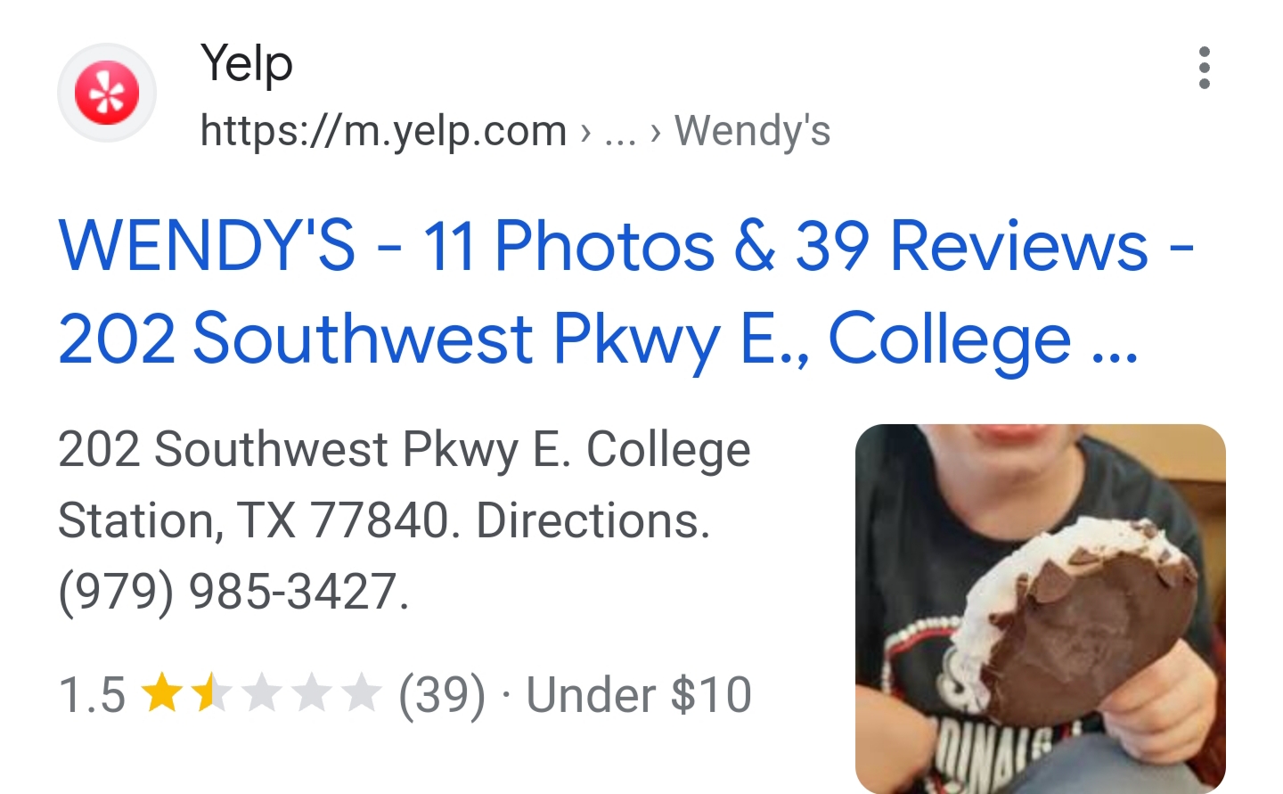 Read moreWENDYS IN COLLEGE STATION...I don't know what happened to this place!!!3 years ago it was great with very sweet help and food was ALWAYS hot I would see the ladies walking home after their shift and wish those ladies were back!!!!..Now you can hardly understand what they are saying and the food is Awful!!!NEVER HOT EVER!!I KNOW FOOD AND MY FAMILY OWNS RESTAURANTS and that food was cooked at least 4 or 5 hours before I received it..I wouldn't feed it to my dog!!!Called local district manager and she said she would take care of it...Right.. Then said I could go to the one in Bryan..Wow...I don't live in Bryan and the reason NO ONE ANSWERS the phone at the College Station one is they don't want to deal with the complaints so the poor people at the one in Bryan have to deal...