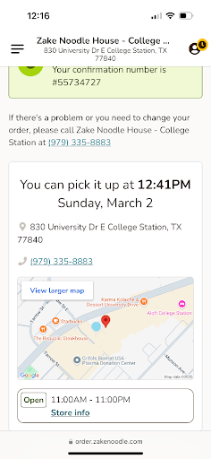 Wait time. I got to the restaurant at 12:40pm, which was my original pickup time. I recieved my...