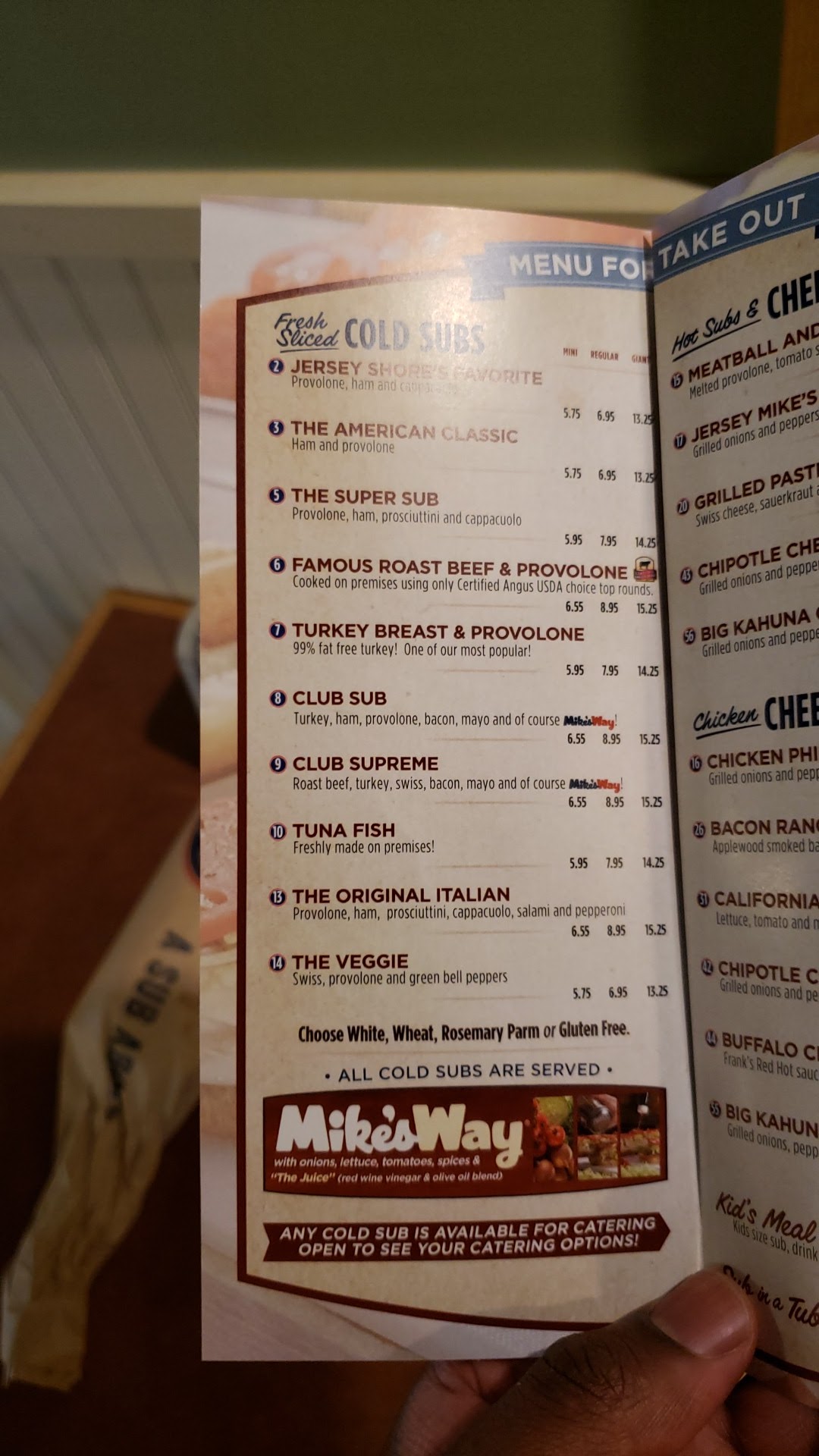 Read moreThe food was awesome first time at a jersey mikes and I loved it my food was excellent and the service was amazing I had never been to a jersey mikes so I didn't know what to expect the gentleman at the counter was super helpful and told me about how the subs work getting them the mikes way and what that entails I asked if there were different breads and I got to try a very tasty herbs and cheese bread and I had a code for a sub that wasn't working on the app for some reason but he made everything work and made the whole experience pleasant he wasn't rude at all and extremely helpful I used to be a subway guy but they have gone down hill over the years and I think I found my new go to for fast and friendly sub service I truly appreciate the experience and will be...