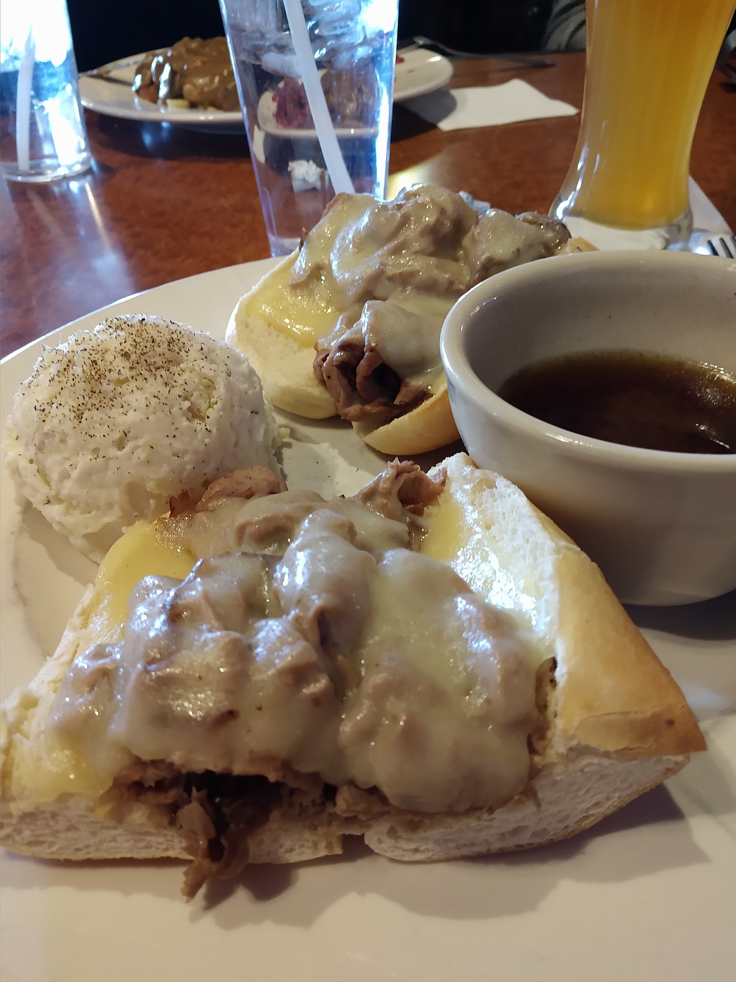 Food arrived promptly considering our table size of eight and the number of other patrons packing the house. My shaved prime rib with melted mozzarella on a soft roll was outstanding. The au jus for dipping was tasty and just the right touch. The only criticism I had, and it's just my personal taste, would be having a nice smear of horseradish or a spicy creamy mayo to go on the sandwich. But it really didn't matter and I enjoyed every bite. My side option was a nice potato salad. House made per Jeremy K. and it was a good choice.