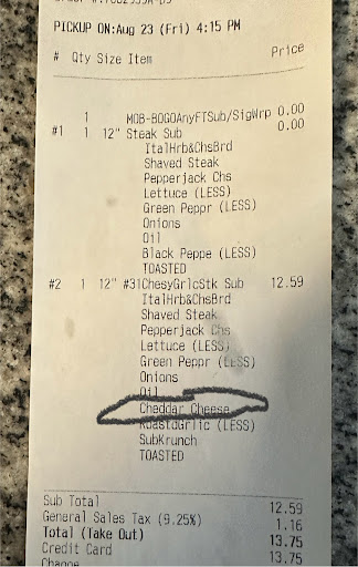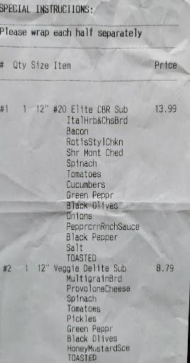 Read moreThe first thing we noticed when we picked up our mobile order was that the sandwhiches weren't wrapped separately, like requested in the special instructions. The sandwhiches also weren't completely wrapped. When my brother asked her to rewrap the them, she refused because we had already touched the bag. When we got to work and opened our sandwhiches, my brother's was very messy with ranch soaking through the wrapper onto his work clothes. Mine hadn't been toasted, had 3 very small tomatoes and regular mustard instead of honey mustard. I did try eating it, but there was too much mustard on it for me to eat since I can't stand regular mustard. I have worked in fast food before and therefore feel I have more patience than most because I realize mistakes happen, but this was just laziness. I have never written a bad review, but I am now at work with nothing to eat, so I felt a review...