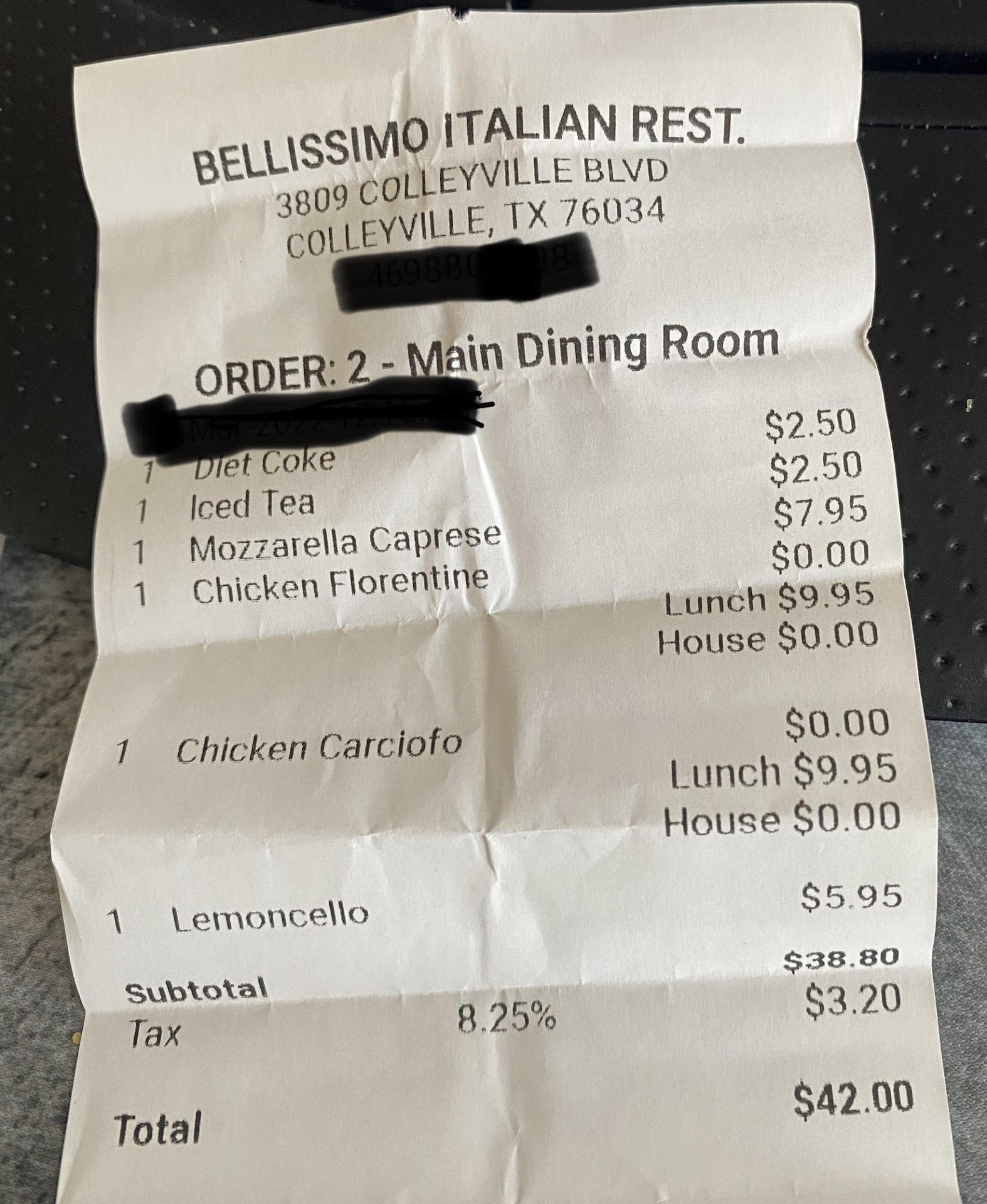 Read moreNot good. Ordered appetizer, salad, entree. Salad came out first, followed by appetizer, and 2 minutes later by entrees. Table full of food. Call me crazy but that is not the order which food is presented nor timed correctly. You should never have multiple dishes on your table at the same time. Let alone all three. The waiter is supposed to control that timing, coordination with the kitchen. Well, perhaps the food would be good. Nope. I ordered the chicken carciofo, wife order chicken florentine. Both dishes tasted identically. Chicken had a fish taste which tells me they'd probably cooked a fish dish and at the very least failed to properly clean the pan or stove top ... at worst used the oil from one on the other. Then we ordered a lemoncello cake for desert. It was OK but waiter presented it with a plastic fork. ... Plastic. We are far removed from COVID protocols so this is strange. As I paid the waiter I asked about it and he said it was because the utensils were wrapped in napkins. You know, like you see on tables. The dinner napkin wrapped around the utensils. So apparently they wrapped up all the forks, had none loose, and opening a napkin was too much ... so we got ... plastic. There's just too many good to great Italian restaurants in the area to...