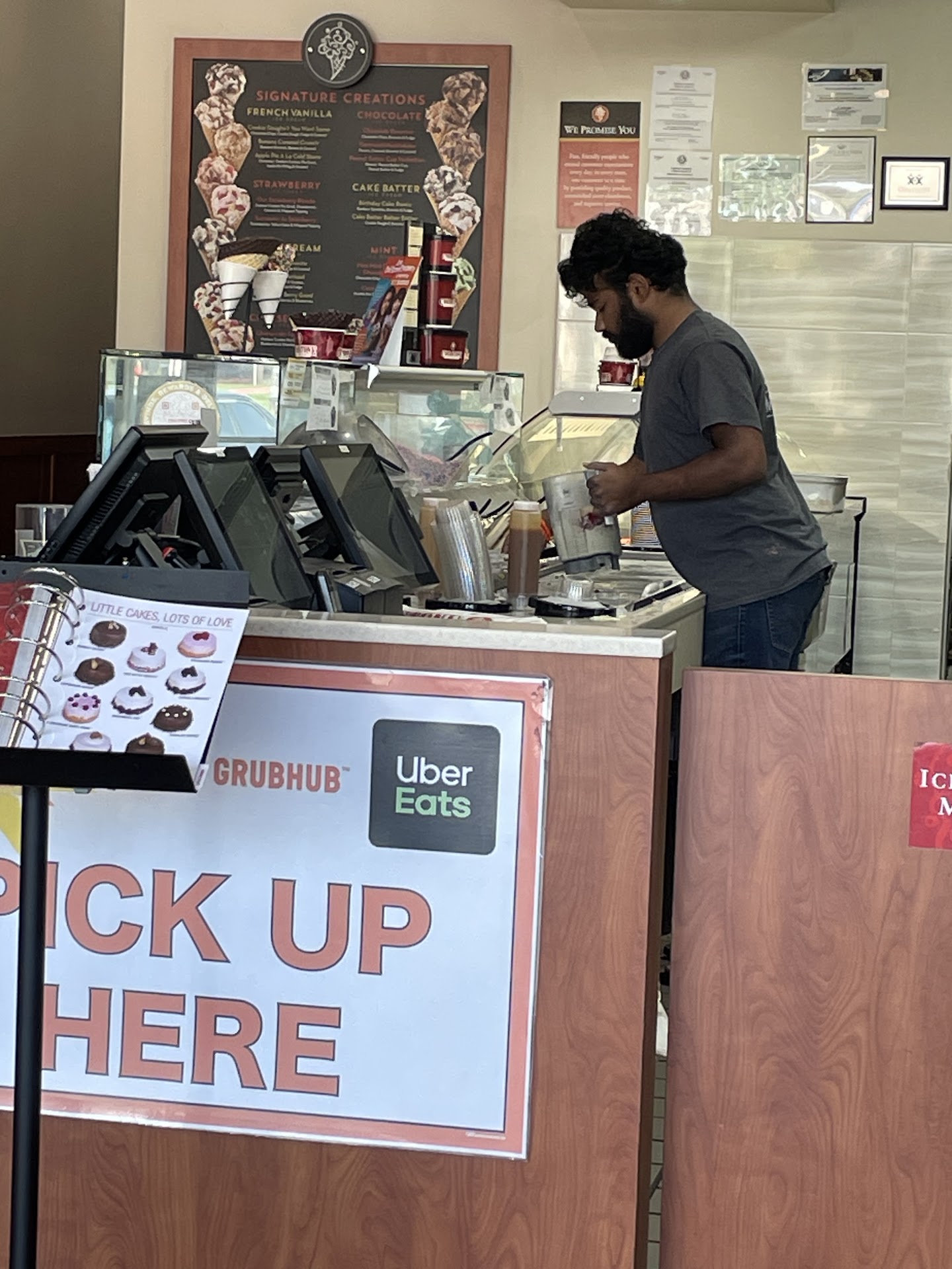 Turns out even though you order on the Cold Stone app they hand off the delivery to Door Dash. So we started tracking the order. 30 minutes after it had already been picked up, the delivery person passed our street, and apparently was headed to get other orders. So obviously our ice cream was melting.
