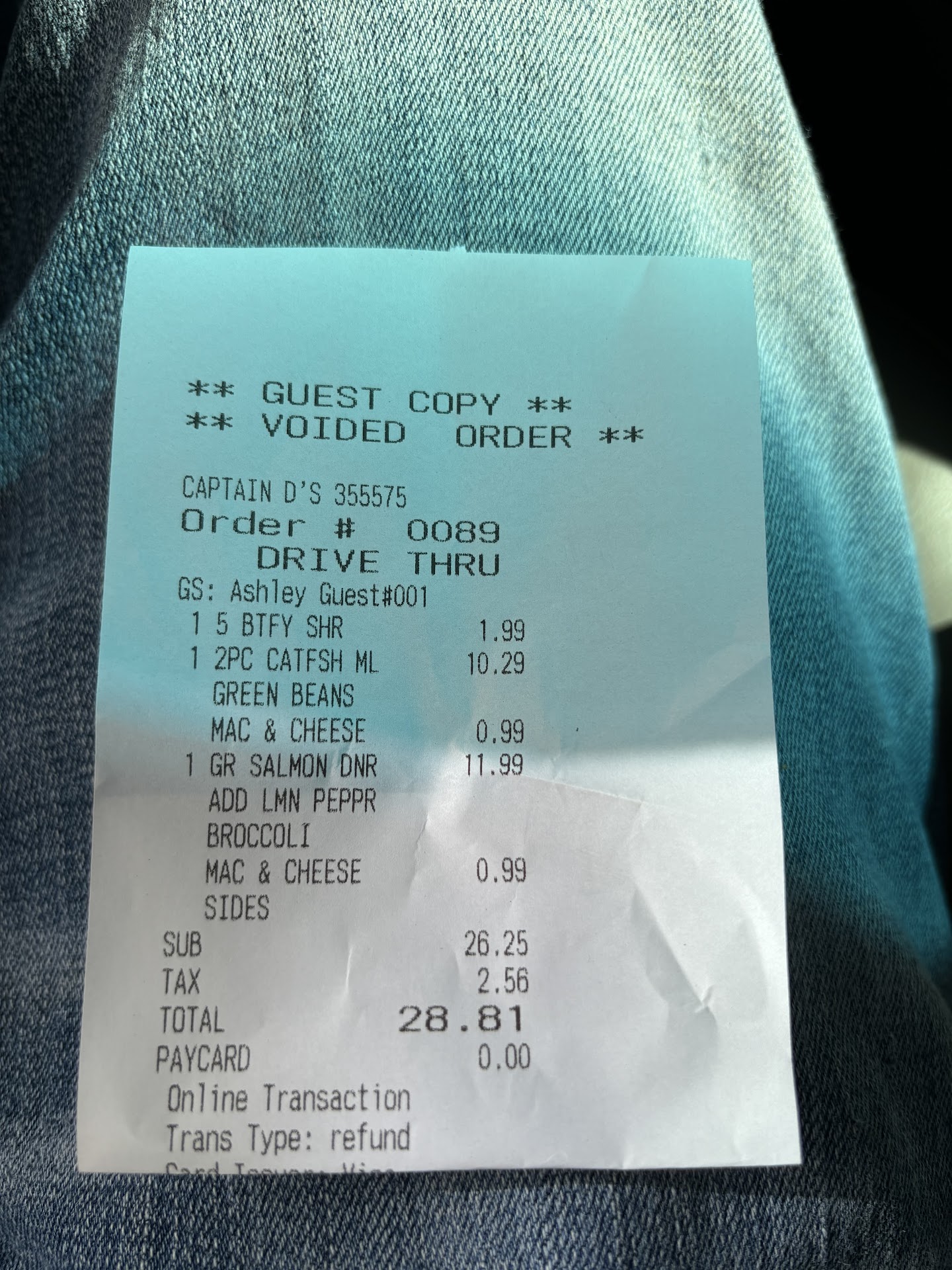 Read moreI went here after visiting my dad in the hospital.. He is on life support.. I haven't eaten all day due to this stressful event.. So 12 butterfly shrimp and double fried okra was what I ordered.. I waited 45 minutes in hopes the food would be hot at delicious, but to my surprise the for was cold, the okra was burnt, I waited to long with no complimentary sorry for the wait.. Free drink, or nothing... This was the only compliant I have ever had with captain d's but this was enough to not ever visit again. Due to the circumstance I was dealing with and the service I received. I advise customers to check your order before leaving the window, and if it is not properly prepared, please make sure there is resolution to...