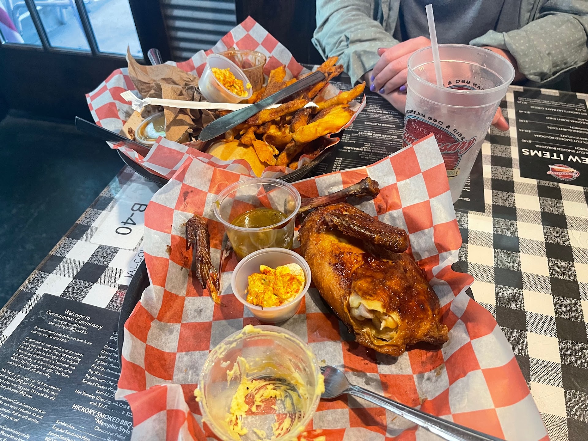 The reason for the one star is the awful ribs I was served. For $20, this was the tiniest half slab I have ever seen. 6 bones, but 3 of them put together was the equivalent of a regular bone. The worst part? Majority of the slab was cartalidge. I spent more time picking and pulling and dissecting that slab that I did enjoying it. Meat was dry (again leading me to think it had sat in the window) which is unusual compared to the g’town location; however the sides were great.