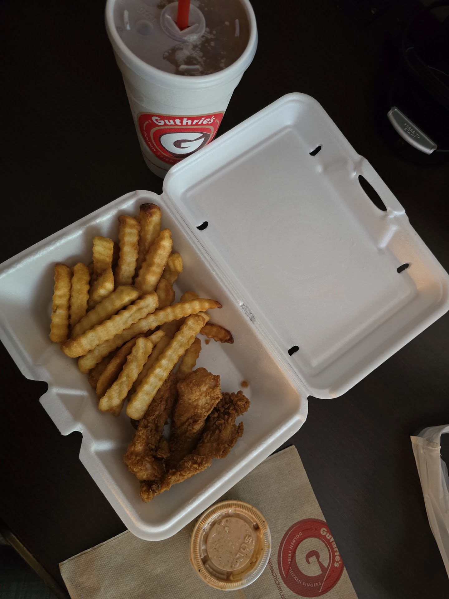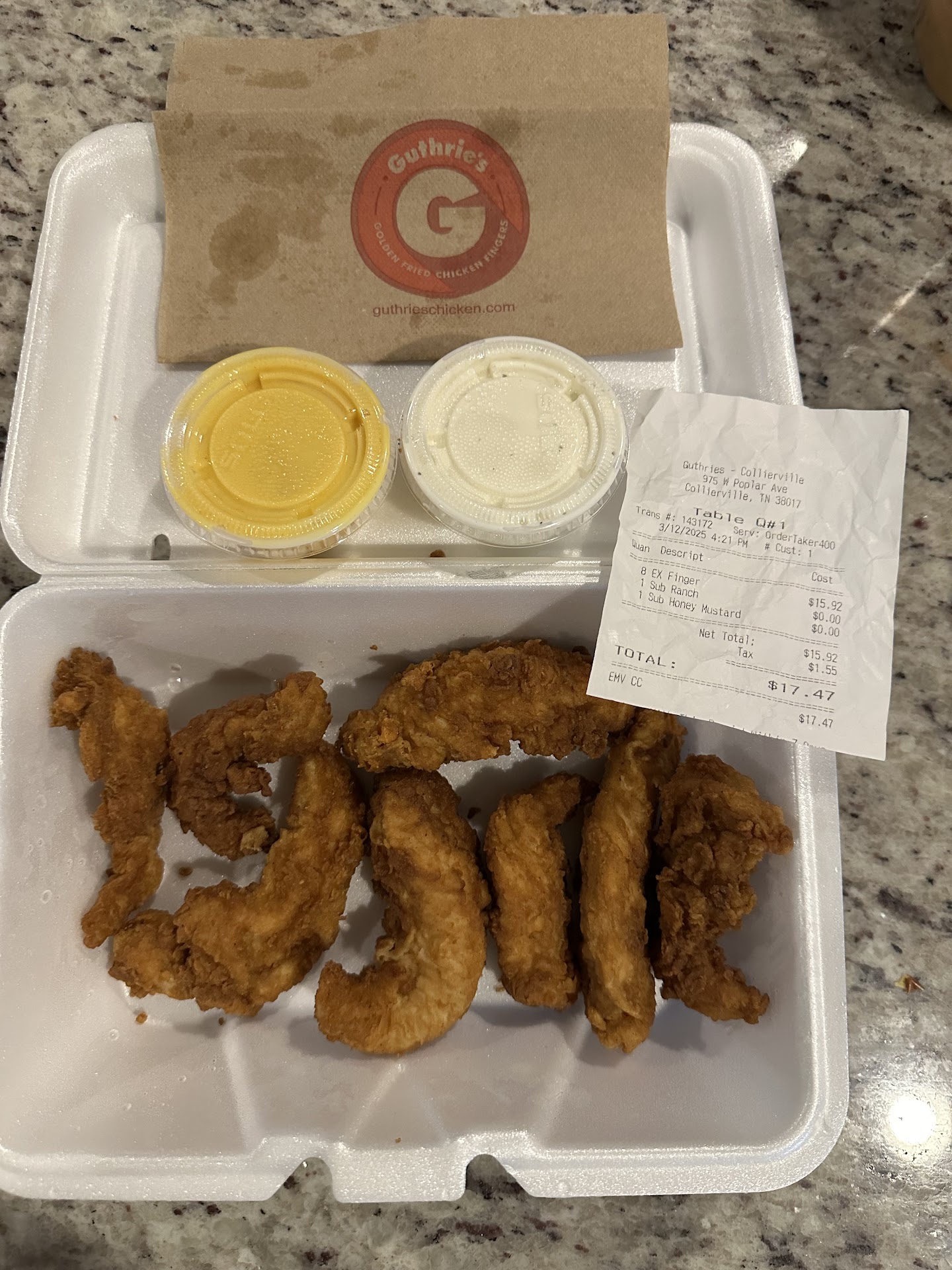Read moreAvoid this place at any cost possible. There is an Arby’s next door, just go there. My last time at Guthrie’s in Collierville was today, 3/6/2023. The owner here has a lot of work in front of them and it is apparent that they do not see it themselves. This will be my fourth time in a month receiving a styrofoam box of chicken that has completely melted through the bottom of the styrofoam to-go box and encased my tenders with freshly melted styrofoam. Everybody loves that. You’d think after the owner decided to establish their bread and butter here that they would have trained their employees to at least put a piece of wax paper down before straight food contact to styrofoam. No matter what the response is from the owner here. Don’t believe it. Go to Arby’s or anywhere else...