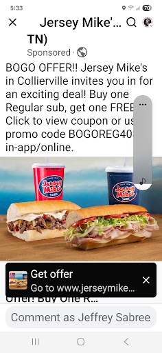 Read moreI recieved an advertisment at 11:30 TODAY for a Collierville special ( see picture) on facebook for a 2 for 1 sub deal at JERSEY"rip you off and lie to you" MIKES subs at 1090 West Poplar in Collierville. I TOLD thrm when I ordered that I wanted the special and showed them the add I got 3 hours ago. At the register I was told the special was for CORDOVA and expired yesterday. The ad clearly says COLLIERVILLE location, see the picture. NEVER GOING BACK TO JERSEY MIKES. GOING TO STICK WITH JIMMY JOHNS AS THEY BACK UP THE ADVERTISMENTS THEY POST. AND THE MANAGER HAD AN ATTITUDE ABOUT IT. NOT GOING BACK AND DO NOT RECOMMEND TO ANYBODY. UPDATE 7-22025. NO CONTACT OR REPLY FROM JERK OFF MIKES. NEVER GOING THERE...