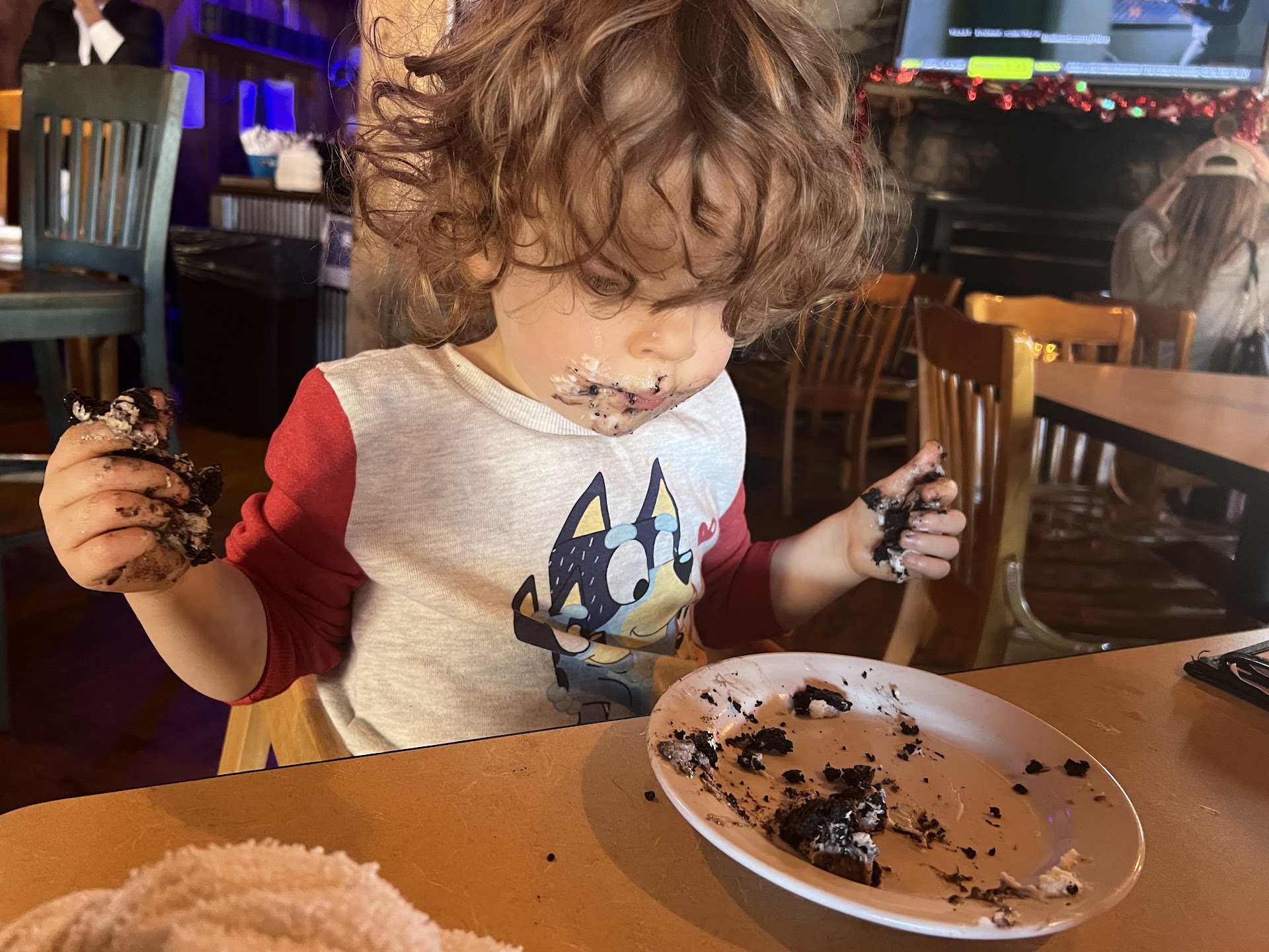 Next thing I know, Mr. Joel brings him a slice of homemade Oreo pie and let me tell you, this baby lived his BEST life! He also brought napkins, a damp towel (clean towel of course), and then some wet wipes to clean him up with lol. My son wasted no time inhaling that pie š! I made sure to thank both of them like 20 million times, and as weāre getting ready to leave, Mr. Joel gets my attention, takes this guitar off the wall, and says āThis is a Kenny Chesney guitar, let the baby get a picture with it!ā, and so we did! Like, how cool of an opportunity!
