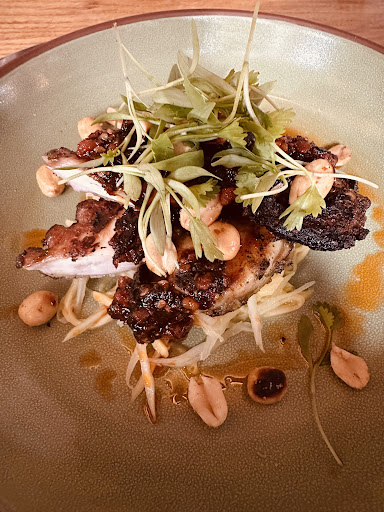 For the third course we had the half chicken, smoked Calabrian chili hot sauce, dill - it was cooked perfectly but the sauce was a little underwhelming. The second main was the monkfish, sunchokes, mussels, citrus ginger broth. The monkfish again was cooked perfectly, but wasn't anything remarkable. The broth was thin, and while refreshing, there was no component to make it cling to the fish at all. I would have liked to see the monkfish with a thicker sauce more reminiscent of a lobster dish. For the last course we had both the opera cake and the budino. The opera cake was pleasant, layers were even, and the strawberry was delightful. The budino was excessively salty - I salted nutella pudding. As someone who loves salted caramel-like flavors, I was disappointed. This combination did not work and is the only dish I would not recommend.