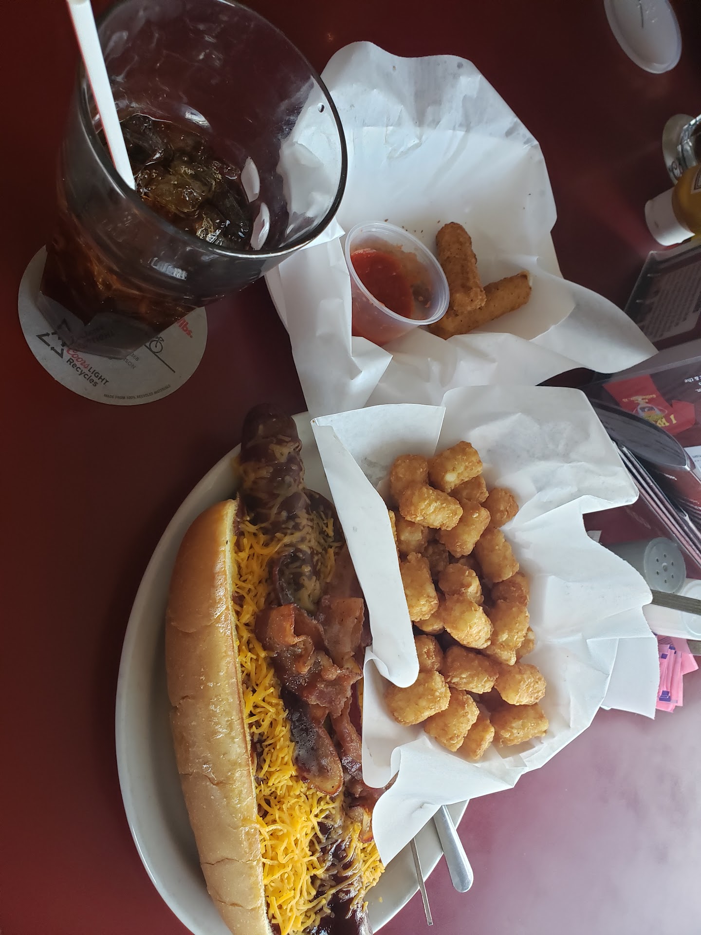 Walked into this place, and it felt like a very small neighborhood bar with just a few people at the bar. The bartender was very friendly when we asked to sit outside. She said that we have to order at the bar if we are sitting outside, no biggie. There were 6 of us total. We ordered 2 coney dogs, a chef salad, onion rings, wings, fried pickles, loaded nachos, 2 BLTs, and tons of drinks. She brought our food out despite being the only one working the bar. Wow, were the portions huge! The hot dogs were amazing and huge. All of the food was delicious. When going in the get refills, I realized that place got busy pretty quickly. The bartender Mallory was still the only one working the bar. She was such a sweetheart and doing a great job keeping up with so much going on. Highly recommend! Can't...