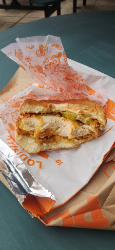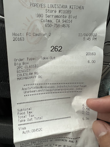Not the greatest but the fastest experience at this Popeyes, in a hurry, this is the place. My son had go to work at 2:00. Parking is quick and previously, there is a wait for a parking space at Fri. 1:10 pm. We ordered the family meal 8 piece including one side Cajun fries and 2 drinks. Ketchup and hot sauce in little packets. While waiting, I noticed we could've bought 2-4 piece meals with drinks included and sides with $4.00-8.00 savings. Counter person didn't say hello and near hostile or neutral expression but laughed with other employee in Spanish. Chicken is crunchy and dry. Pieces are 2 legs 2 wings 3 small backs with thigh, and one Quarter breast. Remove the coating and there is little meat. Cajun fires were tasteless and required ketchup and hot sauce. Lesson one, don't be in a hurry. Lesson two beware of unfriendly or neutral counter service. Lesson three, DO NOT Eat here. Popeyes on South...