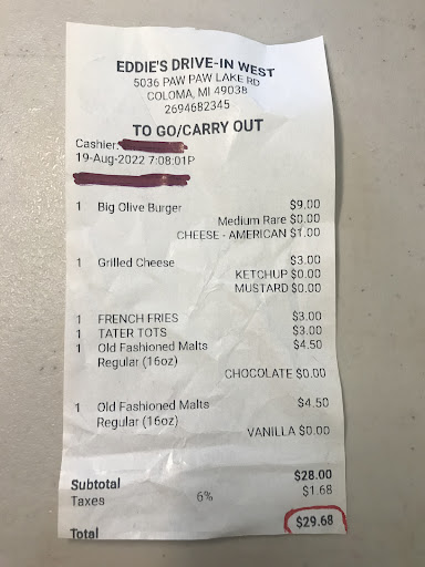 Read moreCalled at 7:45pm and placed an order. They said it would be ready in 45 mins. My husband got there at 8:30 and they were closed. The girl told him they lost our order and that the kitchen is closed now. So he walked away empty handed. A year later (Aug. 2022) we decided to give them another shot. My husband said his hamburger was good but his fries were horrible. They weren’t done all the way and were dripping grease. I ordered a grilled cheese sandwich and only had one small slice of cheese on the left side and the other side was just toast. The tater tots I ordered was not done and also dripping grease. We ordered 16oz malts that barely had any malt in them. So $29.68 later the only thing from our order that was good was the hamburger. We had to throw away the fries and tater tots because they were half raw. What I’m trying to say is if you’re going to charge top price for just simply food you should make sure it’s edible. I normally don’t write reviews but I felt like they earned this one. Check out the pricing on...