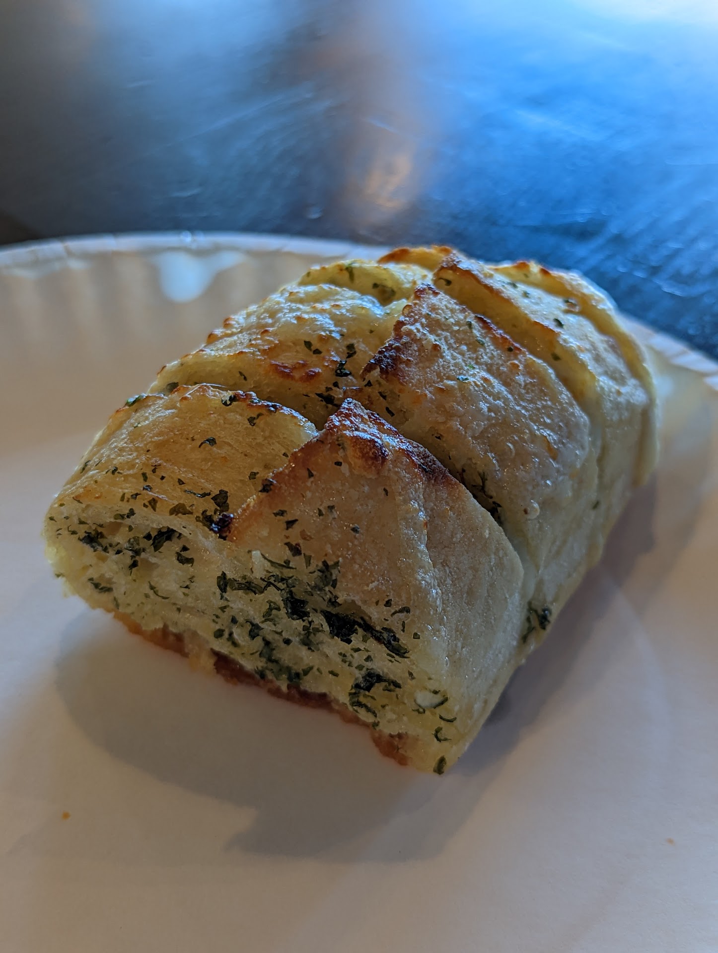 Second, the food was good. Not amazing, but I don't think it's really fair to review a place on their pizza-by-the-slice, which is what I had. I ordered 2 slices, they came out pretty quickly, and were good. They were very large (1/8 of a 22" pizza), the crust was light and a little crunchy, and the piece that I added toppings to was loaded. The cheese garlic bread was VERY good (suggested by the staff - and was available in a single portion size).