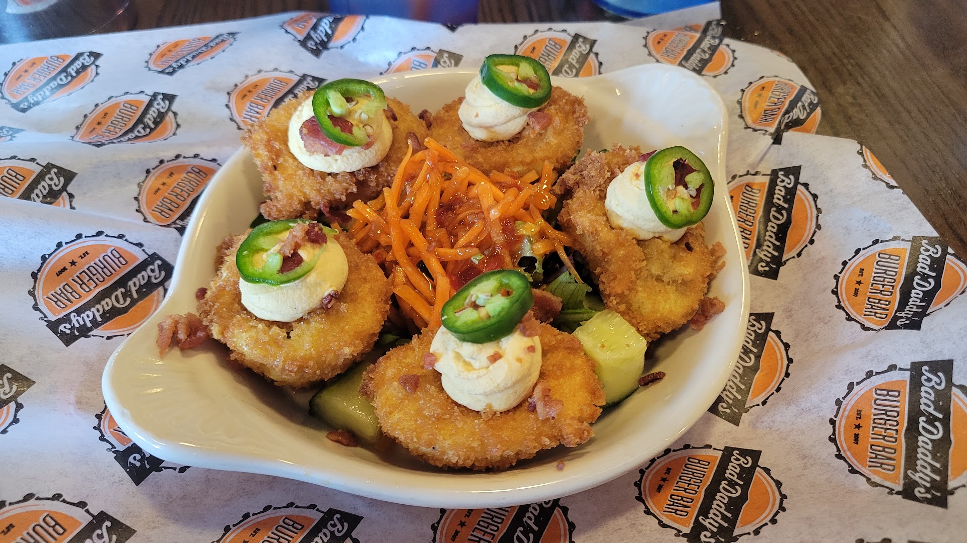 Read moreWe just moved here from NY and have been trying different cool looking food places. Today we decided to try BAD DADDYS BURGER BAR. We ordered an Emilios Chicken Sandwich, a Greek salad with chicken, and chicken wings as the appetizer. The wait was a little long. After a long while, our meals came out. Our waitress (I wish i knew her name-she was blond and very very nice) came out and apologized because something went wrong and our chicken wings order didn't get through to the kitchen for some reason. It was too late for appetizers, so I told her to cancel it. We started to eat our meals. Later on, someone from the kitchen came out and apologized again and told us that we could still have our chicken wings for FREE and we can take them home with us. We were so shocked that they did the right thing. The day before, we had another experience that was the opposite of good customer service. This brought us hope that there still is great customer service in some places. We were very appreciative. The blonde waitress told us that since we were new to the area, they wanted us to leave with a great first impression. Well, you know- people make mistakes, it's how you handle it that matters the most. They handled it very well and I know that I will always be appreciated at this burger bar. I happen to live 5 minutes away and they just gained a loyal customer. Thank you Bad Daddy! (lol) All of the food was very good. If i could make a suggestion, I would tell them that the sweet potato fries should be less salty. They tasted great but were a bit salty. Otherwise, they have good food and I highly...