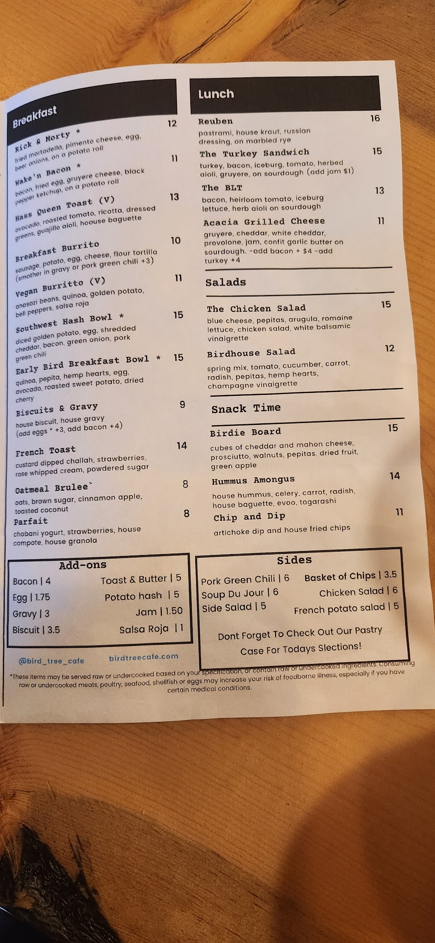 Read moreOur family stopped by on our way through town looking for a quality meal, trying to avoid fast food chains, unfortunately we struck out. 1. Biscuits and gravy - The biscuit was dry and cold, making it unappealing. 2. The Hass toast was very over saturated causing it to be mushy, including the bread, and completely inedible. The tomatoes on it were also mushy and clumped together. All together appearing as if very little care or thought was put into the food. This meal was thrown away due to the reasons above, forcing us to stop for another meal at an alternative restaurant. 3. The breakfast sandwich was tasty, mostly bread and bacon though, again too much sauce. Also note, we began eating the food within a couple minutes of picking it up, giving no reason for the food to be cold or mushy. Allergies beware: We requested a breakfast burrito without eggs due to an allergy and were told they would not accommodate. Overall, we would never go back or send someone to Bird Tree Cafe. They received two stars because the food was prepared in a...
