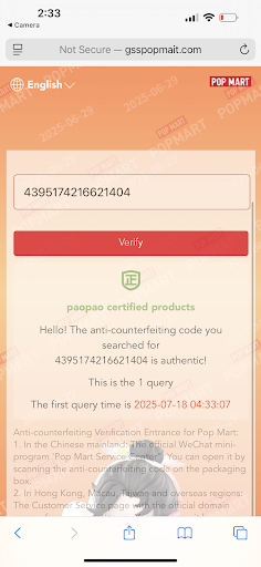 When I got home and unboxed the figures with my daughter, I immediately realized they were fake. I scanned the QR code and it led to a site that closely resembled Popmart’s authentication page, but with a small error popmait instead of popmart. I also noticed poor stitching, which was another red flag.