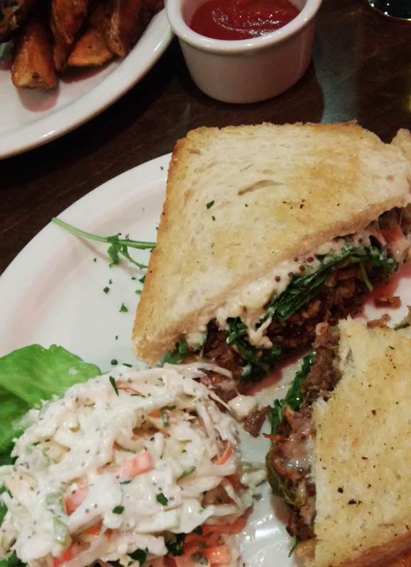 Once the food finally arrived, it was packed with flavor and I realized — this is why this place is so busy! I devoured the Smoked Brisket Grilled Cheese with a side of Apple & Blue Cheese Slaw. Delicious! But I could have easily split it — it was so rich. My husband agreed, saying the same about his. He ordered the Fried Green Tomato BLT with a side of Pub Fries.