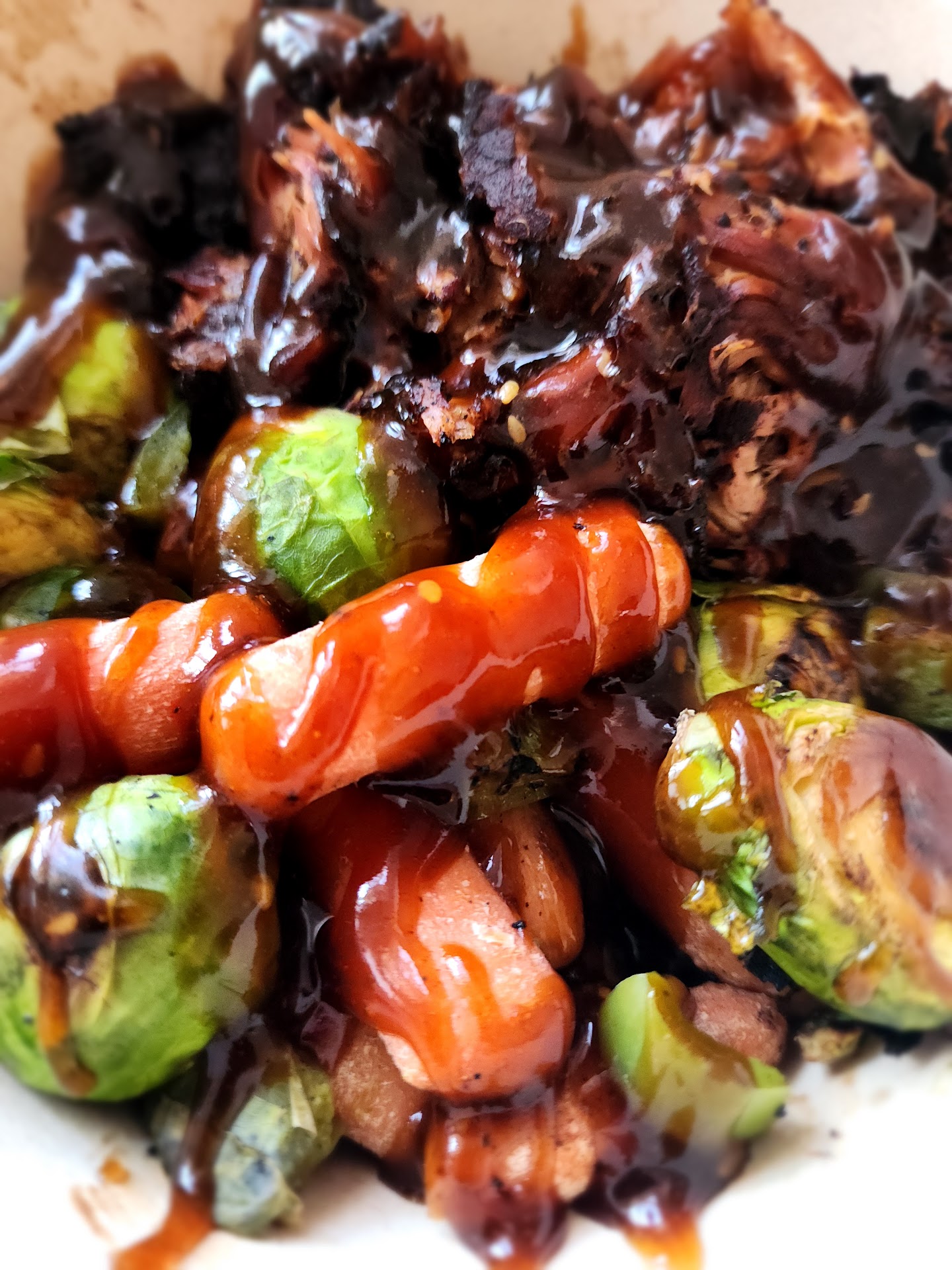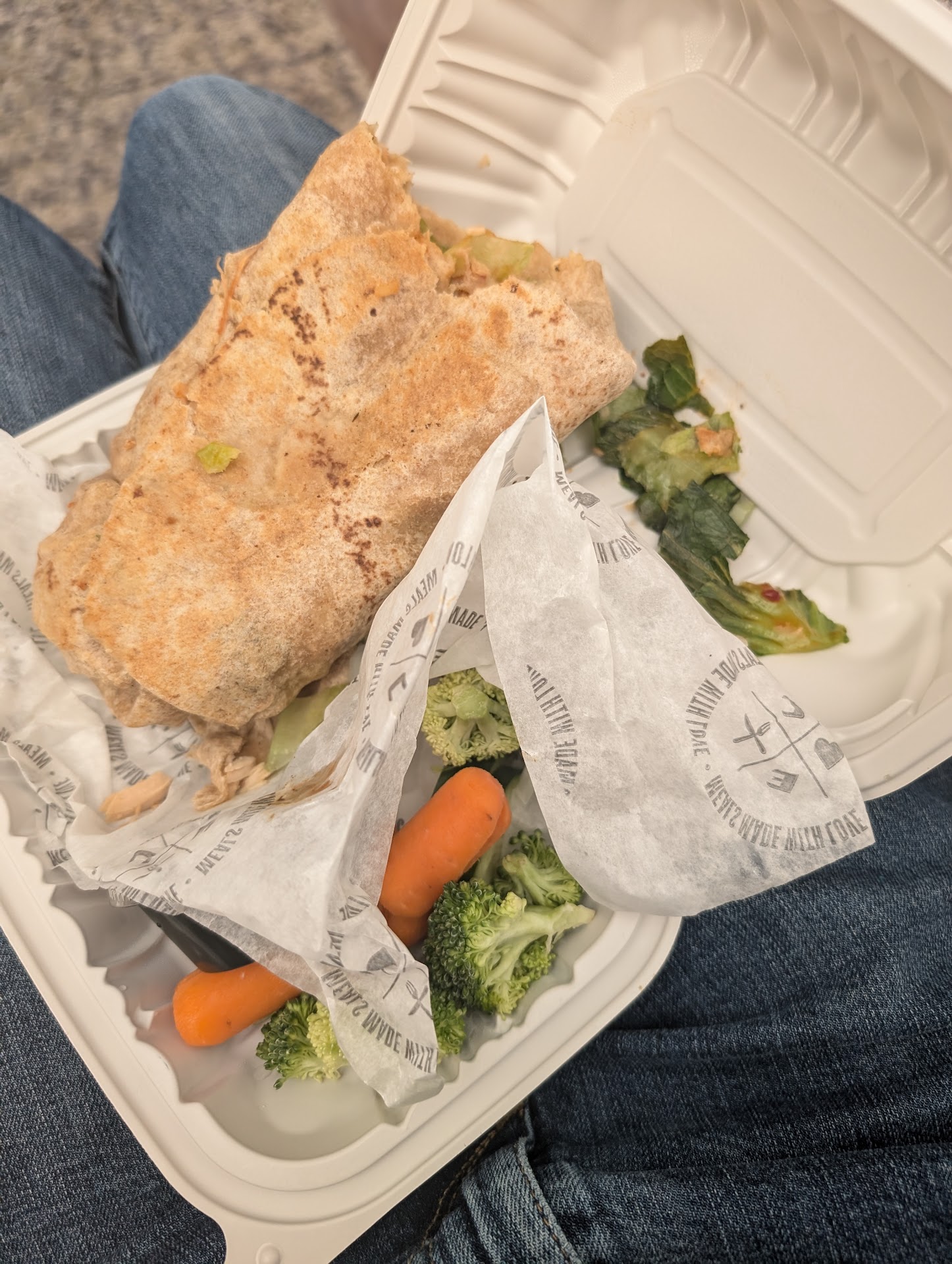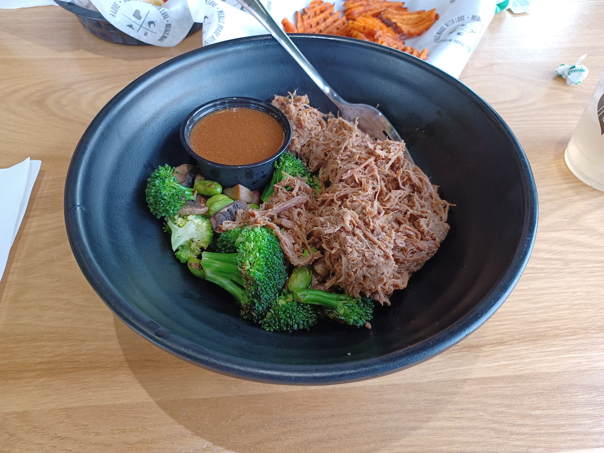 Who says eating healthy means you have to pay more for food that isn't delicious. On this visit, we had a custom bowl; shredded beef, edamme, broccoli with Thai peanut sauce, which was fabulous and portioned to fill you up. I tried the new Burnt-ends Turkey Cuban that featured flat bread, turkey, cheese, and BBQ sauce over the mustard in a standard Cuban. It was just as wonderful as the beef bowl. For the sides, we got sweet potato fries and apples with peanut butter dip.