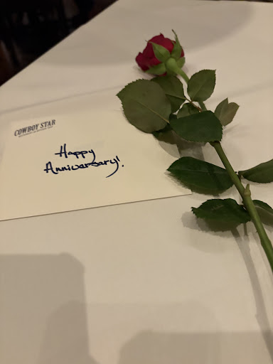 I would give this place 10 stars if I could. My husband and I were up in Colorado Springs celebrating our anniversary for the weekend. Friday night we did some google searching and watched several TikTok reviews and ultimately decided to take our chances with Cowboy Star. We made a reservation for that same evening and hoped for the best. Upon arrival the hostess was kind and the decor was breathtaking. Fancy and elegant with that perfect hint of Country. They have an open kitchen which is amazing to get to see everything in action. The wine and cocktail selection was impressive and our wait was short. When we reach our table, there is a rose and a "Happy Anniversary" card which had been hand-signed by the staff. Our waiter Josh was off the charts informative, polite, attentive, and made sure our experience was just amazing start to end. We were handed custom printed menus that read "Happy Anniversary" on the top. (WHICH THEY ROLLED UP AND TIED WITH A RIBBON FOR US AT THE END AS A KEEPSAKE!) We ordered the Steakhouse Slab Bacon as an appetizer and let me tell you, this was not merely your average crunchy little bacon slice. This was magical. Juicy, tender, exploding with flavor. Like nothing we had ever tasted. We were brought a delicious gift from the Chef consisting of four very random sounding things stacked on a spoon, they should not have worked together as well as they did but oh boy was it delicious. I wish I recalled what it was called but it was a cracker with some sort of pistachio creme, prosciutto, and a blackberry. Random, but phenomenal. We then were served a yummy bread roll and butter while our meals were being prepared. We shared the 40 oz Porterhouse Steak for two as our main course and also ordered a lobster tail for the table. They brought us individual plates with mashed potatoes and broccolini (both of which were delicious) and brought out our steak on a skillet. The steak was out of this world delicious. Juicy and tender beyond our wildest dreams. The Chimichurri sauce paired with the steak literally transported me to another planet with each bite. The lobster was also delicious and very fresh. To say we were stuffed is an understatement but given the occasion and how delicious everything had been this far, we ordered desert. We had the Chocolate Chip Bread Pudding paired with the Espresso Martini. IT WAS AMAZING. The bread pudding is warm, soft, gooey, and paired with fresh strawberries and creamy chocolate ice cream. Your leftovers are boxed and kept warmed for you until you are heading out. This place is just all around fantastic beyond all words. From the ambience and decor, to the food and selections, to the sweet, warm, and over the top little details showing they truly care about what you are there to celebrate. We will not only be recommending this place to everyone we know, but are also seriously considering this to now be our go to anniversary tradition henceforth. 100% worth the drive from Denver, or anywhere else. 100% worth the high prices, you cannot beat this wonderful experience and phenomenal food. Outback could never!!!! Treat yourself to this place at least once in your lifetime!...