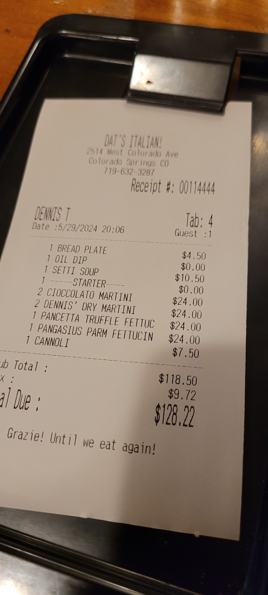 I've posted our reciept here, to be honest, what we'd like most is a chance to return to Dat's Italian, to experience what could've been a great restaurant experience. To return however, we would need a couple of free entrées or drinks, as our first time there this evening was one of the worst value for dollar experiences we've ever had.