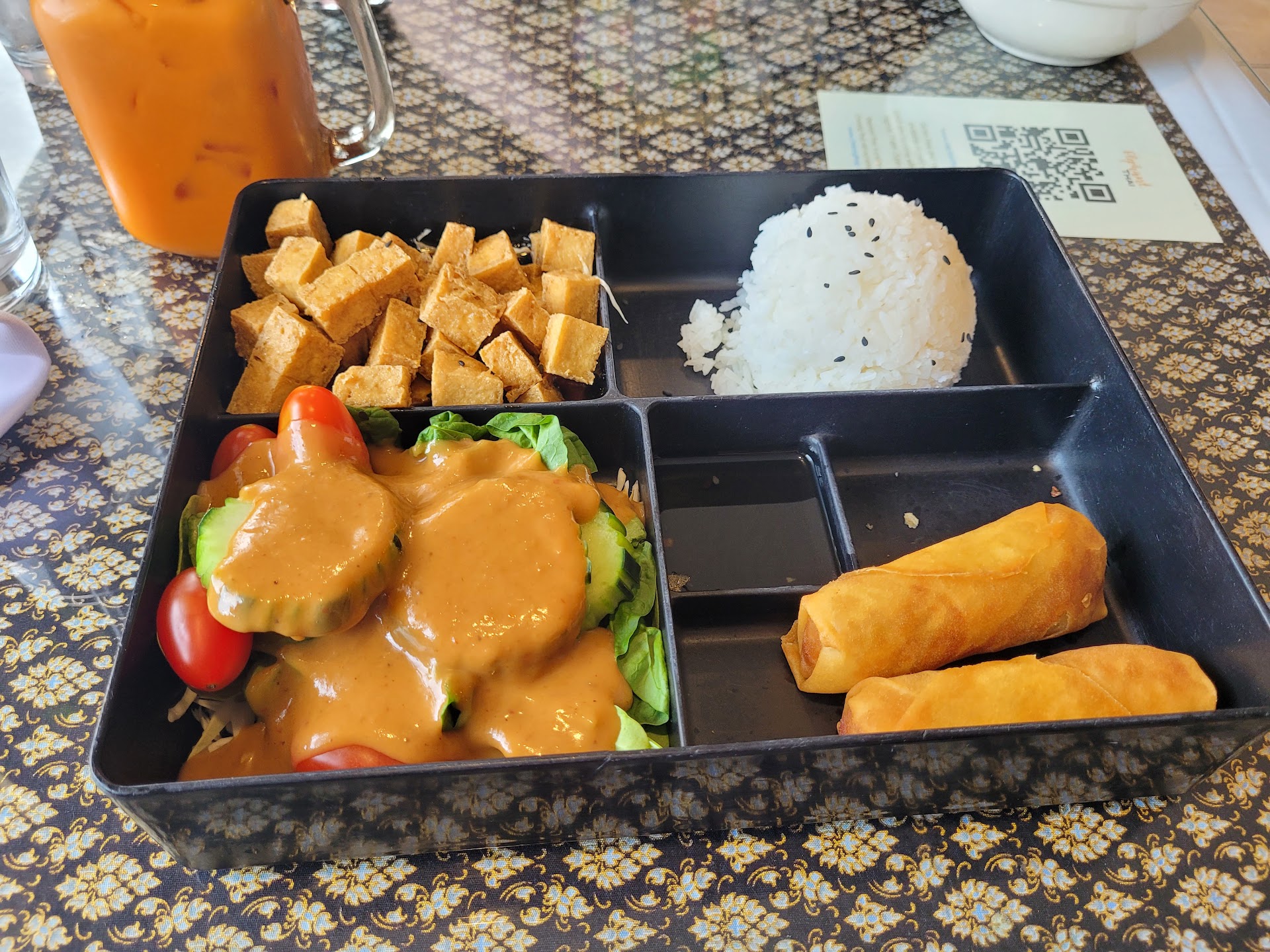 Absolutely my new favorite restraunt! This was the best meal I've had in like a year and certainly not the most expensive. I love that they have a dedicated vegan menu (you have to ask for it) so I can not have to sift through the regular menu to find something I can eat! I had the teriyaki tofu (bento tray) and it was AMAZING. Literally perfect in every way, the tofu was cooked perfectly, there was plenty of very tasty teriyaki sauce and yummy rice, there were vegan spring rolls and a little salad š„ with yummy peanut butter dressing. Very filling and good portion size, my only complaint is it was so tasty I gobbled it all up and then I felt too full! (I usually save a quarter to half of a meal at restaurant for left overs since portion sizes in restraunts are unhealthily large). I also had a thia iced tea with Coconut milk which was yummy.