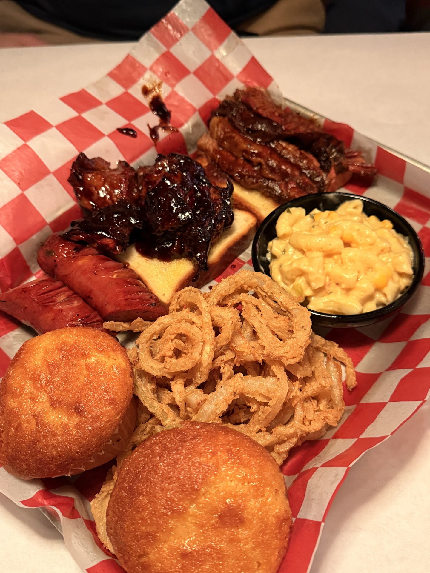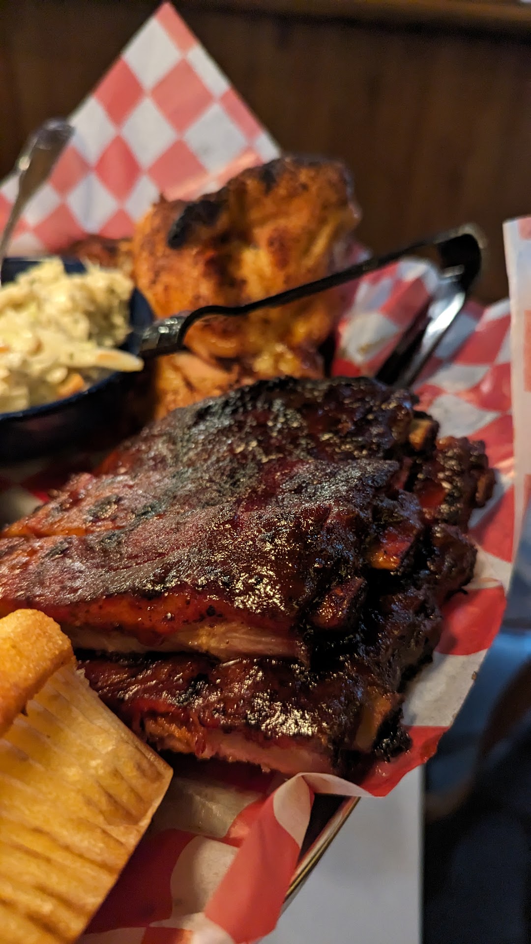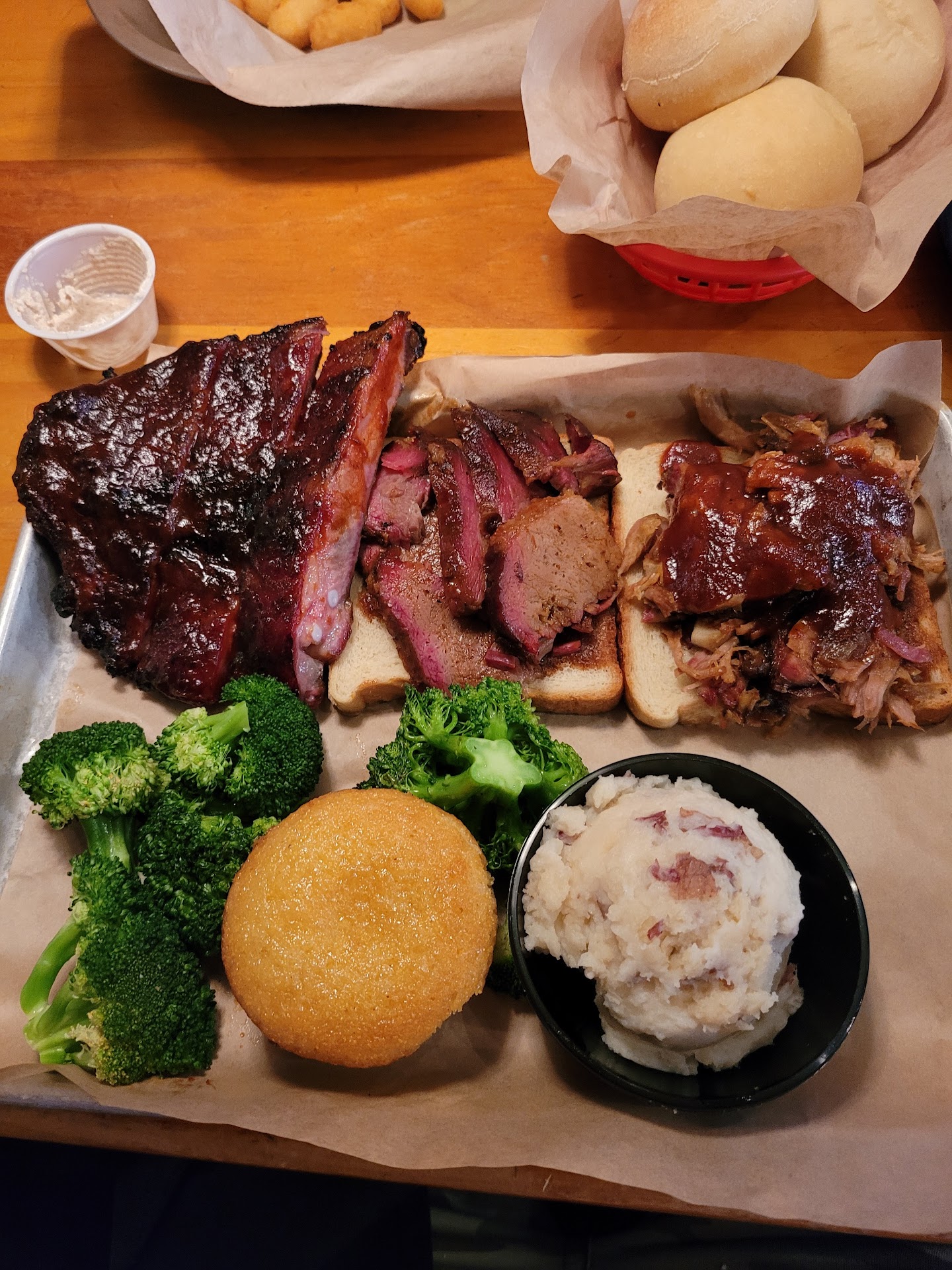 Read moreHaley was absolutely amazing. she was very busy and still took care of us and everyone in a very efficient manner. this woman is valuable to your company and deserves a raise and some appreciation shown. she's the main reason for your 5 star review. the atmosphere was amazing i enjoyed the fact that it was busy but I didn't have to scream or ask what while talking to my guest the cheese curds were phenomenal . I did kind of expect to get more than what we did for $13 but quality was there. I didn't get a picture of them unfortunately however you can see them with the chicken sandwich . rolls and butter are always amazing to me. one complaint my guest had was that you don't serve regular butter with the rolls. Is this an option or can it be? my guest was extremely pleased with the chicken sandwich and cheese curds add on. I got the pick three platter. broccoli was cooked perfectly as i hate mushy vegetables. the garlic red potatoes were great flavor wise just a little dry. so maybe send a small amount of butter out with them or put a small dollop on top before sending them out. Now onto the meats. I added a fourth meat which is the jalapeno sausage sitting on the blue plate all alone. personally I find it a waste of time and unnecessary to put it on a separate plate. put it with the rest of my food. or maybe have the server ask that because some might want it separate but having a lot of BOH and FOH experience id rather see less dishes go out as well as the sausage dies a lot faster by being on a cold plate and being by itself. I also got the chopped pork I was only happy with 2 bites almost every bite of it I took was a different profile of seasoning and some of it was extremely dry and chewy. the sliced brisket was okay. nothing wrong and nothing to brag about. now onto the ribs this is what completely saved the meal. ill be back for a full rack of ribs and hope that they are as good as the ones I got with my meal. best part was honestly the fact that yall kept the tip on a lot of places cut it off and I always am disappointed. great job over all.