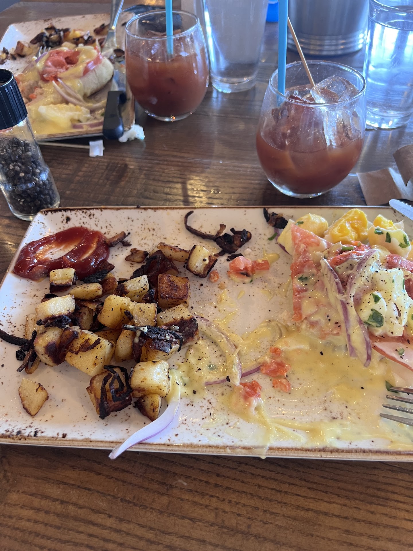 Now for the food- we both ordered smoked salmon eggs Benedict with potatoes. When they set the plates down my first thought was “ummm did you not look at these on your way out?”, second thought “who do they have cooking in the back that would plate up burnt potatoes?” The potatoes were burnt burnt… like charred black on one side of every piece of potato… the onions cooked with them were burnt so crispy they were inedible ….