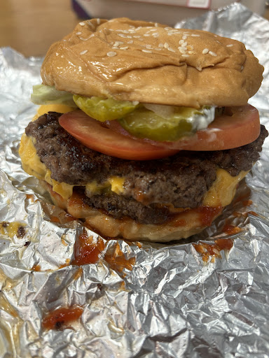 I can honestly say this establishment is the place to go when you are in need of healing your stomach with get right food. This was my first time in here. The associates customer service was so fantastically welcoming, relaxing, yet proffessionally warm & friendly at the same time; making us feel at home. Inside Five Guys was really clean; not so crowded & noisy. Smelled clean & absolutely meaty. I was ready to eat some meat. Our food was wonderful! Freshly made to the degree we requested. My big 'ol double cheeseburger & my husband's big 'ol chilly cheese dog were hot & juicy. They were dripping sauce & oil down our fingers down our hands & onto the wrappings. We split awesome fries which we were able to wipe up that delicious drippy sauce with & stuff our faces like we weren't going to eat so good again. I didn't want to get up when I was finished. I was so stuffed, so full. Like, that little blueberry girl on Willy Wonka who they rolled away. Ya, roll me if you have to. Lol, but I didn't want to go. Their burger was so Delish, I wanted to make myself eat another one. I didn't care how HUGE it was. Eventually I got up & left. Had to buy a car, we were car less.😞 Someone smashed into...