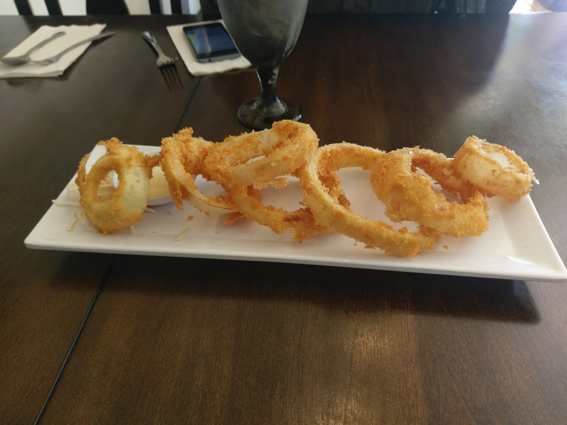 The delicate onion rings were light, and had a tendency to crumble if exposed to too much pressure. I blame this primarily on the scarce breading, which did not cover the whole of the rings, and what was there wasn't on all that tight.
