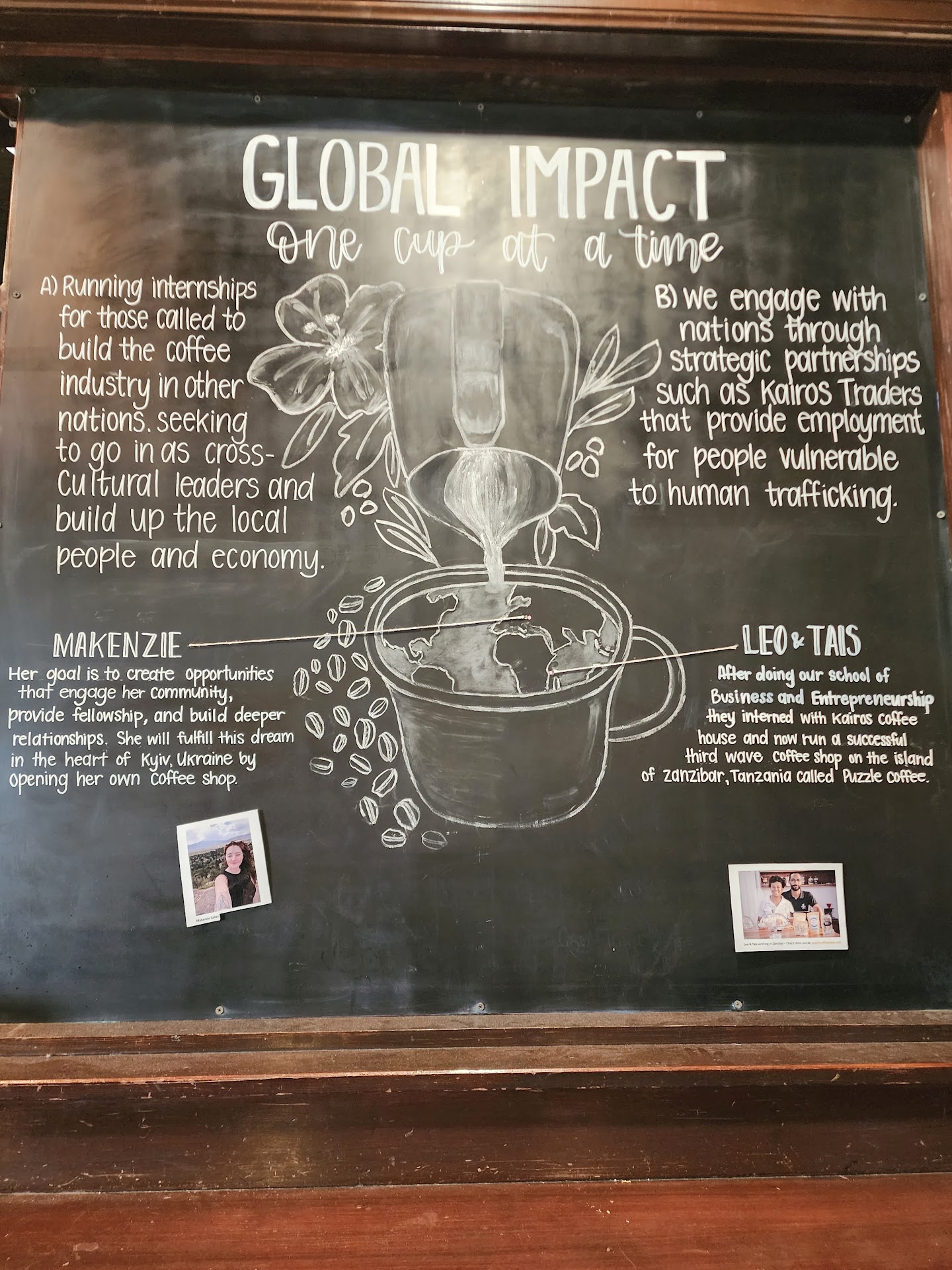 Kairos offers that, even while under some construction. Walking into what appears to be an older conference center, or just an addendum to YWAM, this little(big?) Cafe keeps on keeping on. Offering the typical coffee options, plus cortado, scones, croissants, and breakfast sandwiches, they also offer some unique coffee styles.