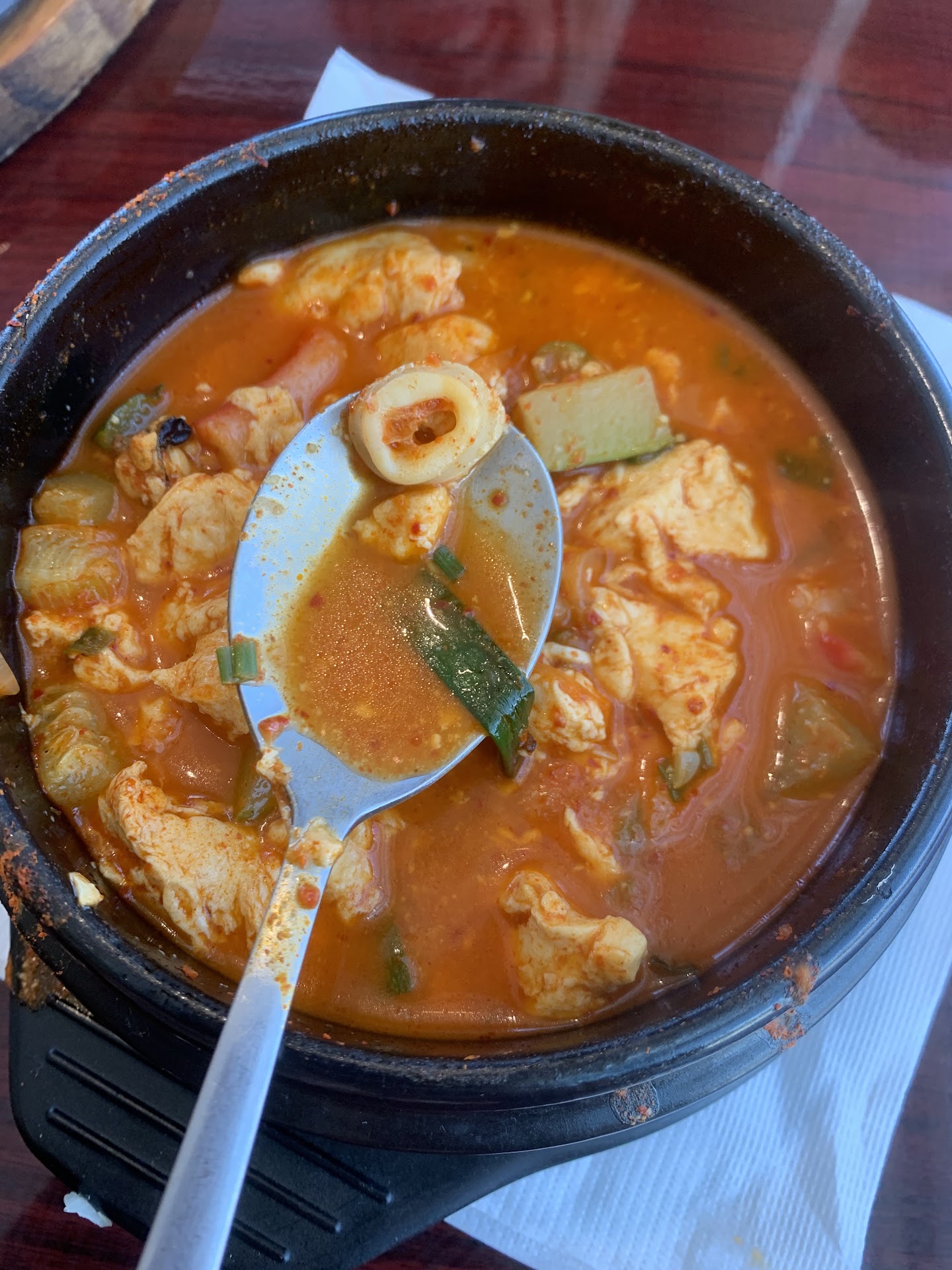 What was the tipping point? I had to ask for salt for my stew to season it to the point where it tasted acceptable. The bulgogi that I ordered for my son tasted and looked like the same (in fact, pretty sure it is the same since I've had it ton of times) bulgogi you can buy at the Korean market not to far in those plastic containers. Costs less and you get more meat if you do it that way.
