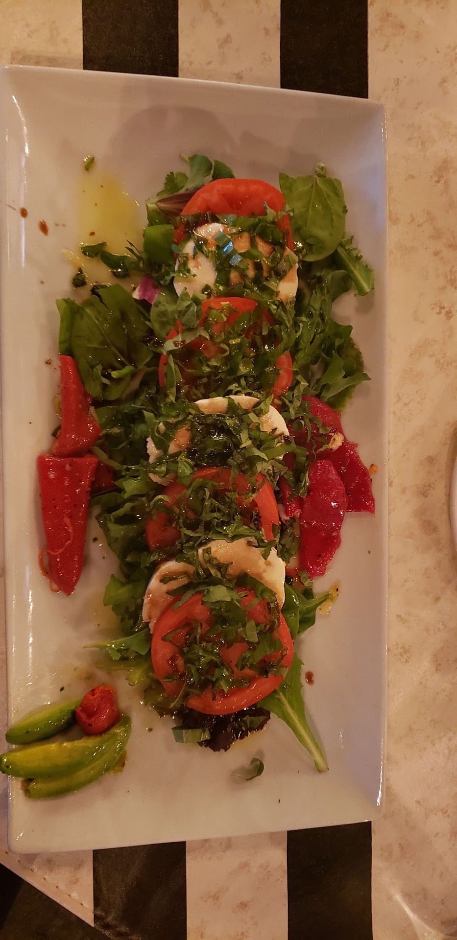 Because the soup and bread were a little disappointing we decided to share a caprese, our favorite salad. The waiter apparently misheard and brought us two $16 salads we were just trying to sample together. My SO confirmed that he doesn't like arugula in his caprese, so I was left to finish his when he couldn't eat more. The two plates tasted completely different. His had hardly any balsamic, and the amount of blood orange infused olive oil was overwhelming. Overall, I think the way they made their caprese covered up rather than enhancing the simple ingredients. The tomatoes also...