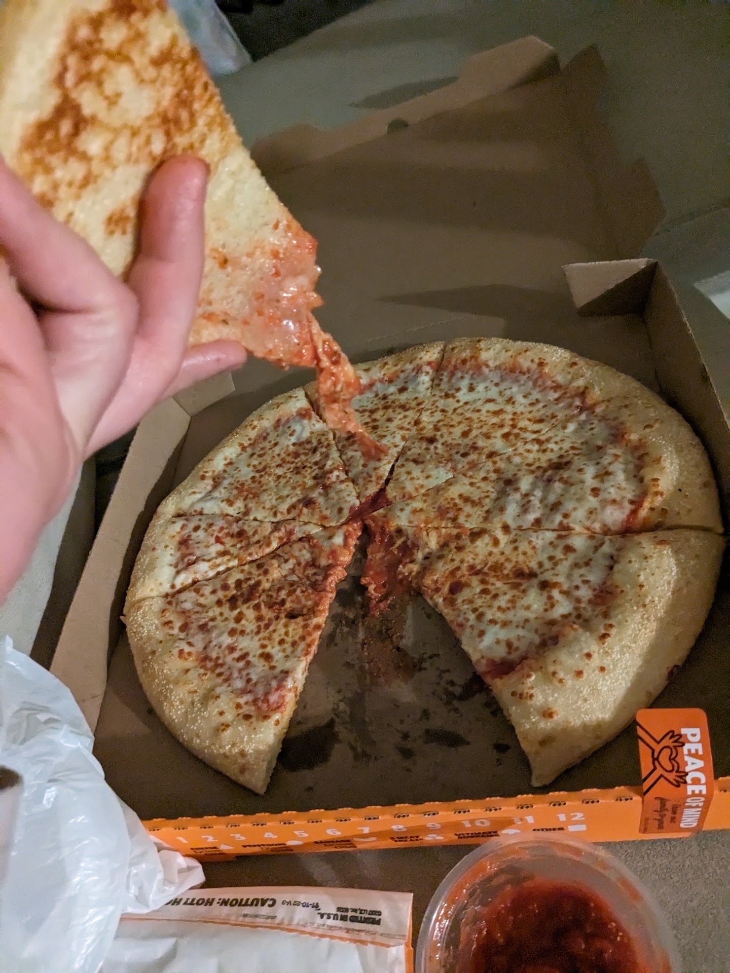 Read moreMy food is basically inedible. So... I stopped by here about 9:15 this evening, about 45 minutes before they closed. It's been a long week, I'm exhausted, and I didn't want to cook. I was craving some good soft crazy bread and a hot and ready to go pizza. What I was served was some stale crazy bread, several of which look like the dough had not risen. Those ones were literally the size of my index finger. That is not what crazy bread is supposed to look like. They were too hard to even chew. The pizza was lukewarm at best, and there were spots of cheese on top that were burnt. I guess the workers here tonight care more about walking out the door right at 10:00 p.m., instead of making fresh pizzas at 9:00 p.m. so that people who are coming in (on a Friday night, mind you) have fresh food to eat. Instead they're worried about getting out the door, so they're serving old garbage that's been sitting in the warmer for far too long. I will not be back here. This is absolutely absurd. Now I have to eat cereal for dinner after I spent $15 for food that is garbage. This is pretty typical of the food I receive nowadays here in Colorado Springs. Everything is just pretty...