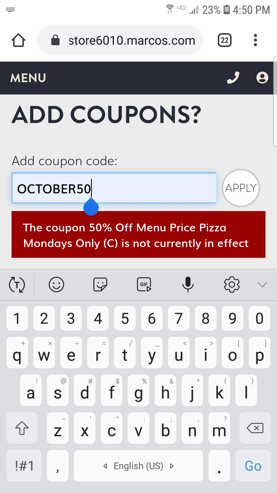 Thinking surely they had just forgotten to add the coupon yet again, we called and were told "the general manager said we're not doing that special." That's a whole lot of build-up for no delivery, amirite? Way to save a few labor hours on a single Monday at the expense of brand integrity, GM guy. Slow clap for the GM