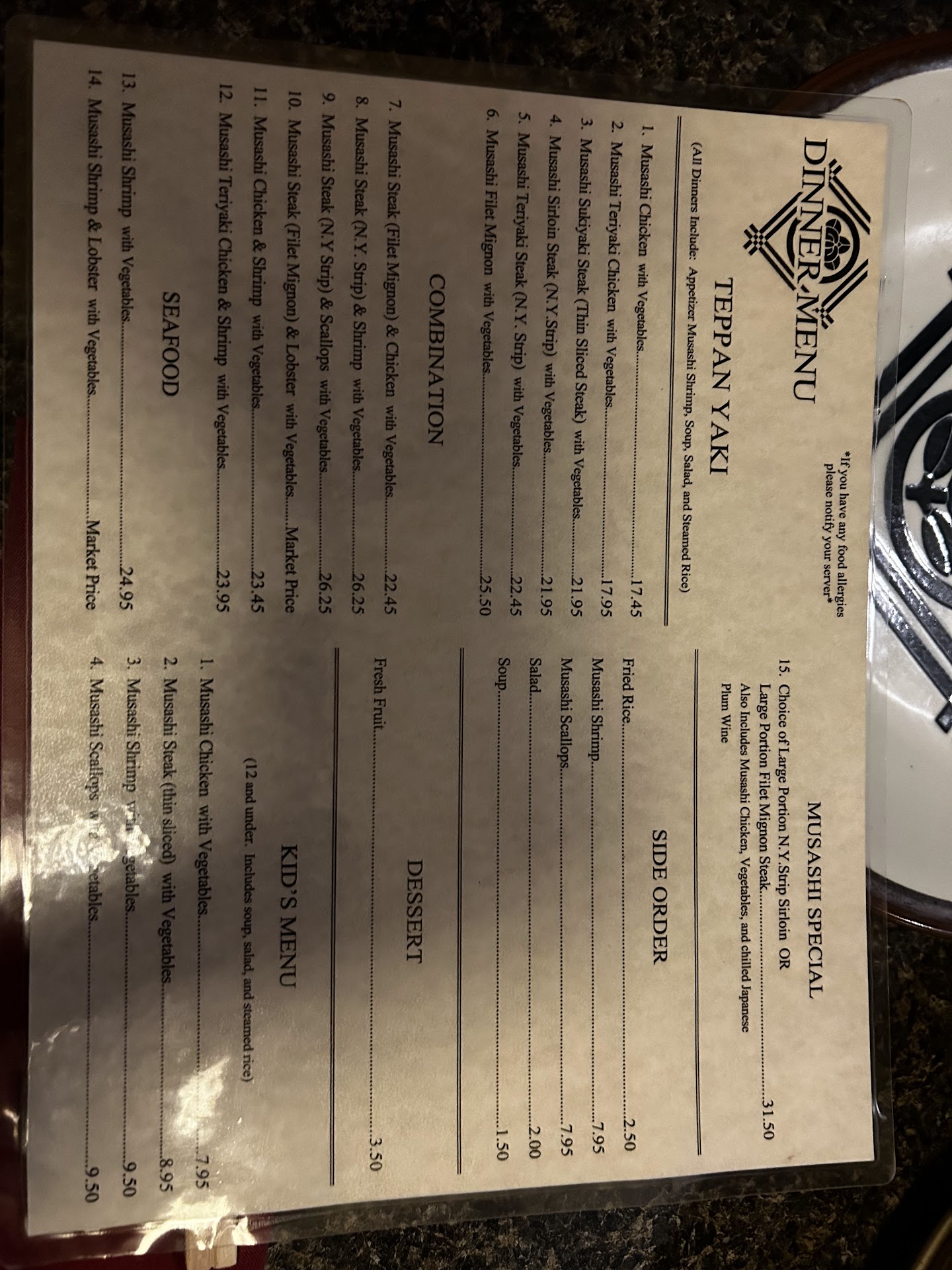 Read moreWe decided to try Musashi out on Christmas Eve without reservations. We figured we could just hit up another Asian restaurant if they were booked. We walked right in at 5p (when they open), were greeted and shown a table. The staff asked if we had any allergies and were very serious with how much of an allergy my wife had to pineapple since they do make drinks with it. She was extremely pleased with that. The chef came over a bit later and was friendly and entertaining. My kids hadn’t been to a teppanyaki style restaurant before so it was a blast watching their reactions.