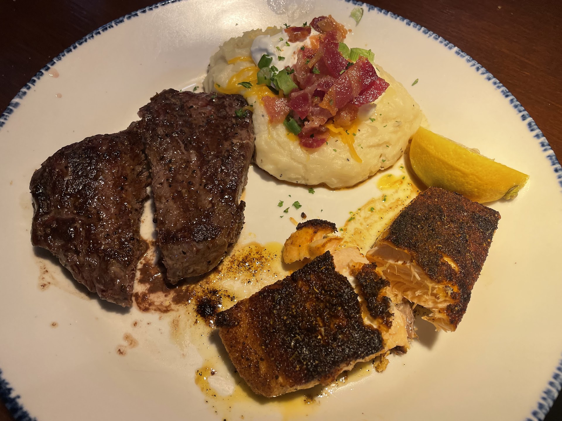 We decided to share the Steak and Blackened Salmon with Loaded Mashed Potatoes and Brussels Sprouts.