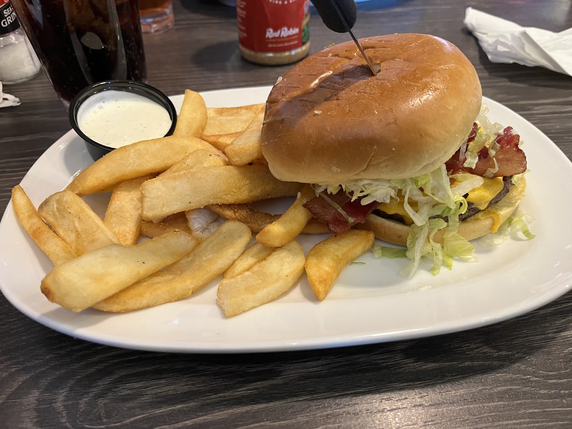 Read moreAbsolutely atrocious service and mediocre meals at this Red Robin last night. Went for a cheaper, lighter, faster, and easier meal after our trip to the Renaissance Festival for our wedding so people could just do something easy or get drinks, however, it was just about all BUT that. The restaurant had maybe 4 or 5 tables sitting down and we had to wait a couple mins to get a table together for 11 people, not a big deal. Our server asks us if we would like drinks, I get my coke zero but never saw my water. My son had ordered the "bottomless" steak fries and received more fries only one additional time even though he asked for more a few different times (I literally NEVER got more of my "bottomless" fries) but for some reason they were more than happy to continue bringing out bottomless broccoli for my brother, not an issue there at all have as much broccoli as you want apparently! My burger was good. Can't complain there at all, just never got more fries and wouldn't have paid for them to begin with if I knew I wasn't ever going to get more than the one small serving of fries they gave me. My new wife, however, had the absolute worst experience. The server poured coke all over her back and didn't notice. She apologized profusely after she had realized what happened but then proceeded to nearly do it again, maybe we need a different method of delivering drinks across a table? She removed her entrée from the order as an apology but when she finally went to eat her chicken wrap... she tried to bite into the most hard, stale tortilla I've ever seen at a restaurant. Had them take it back, no remake, just give us our ticket so we can be done. Mind you, this place was DEAD. HALF of my party only ordered drinks and we were waiting upwards an hour for food. This is by far some of the worst service I've ever seen from a restaurant as a whole in my life. I will be submitting a corporate complaint and I will NOT return here.